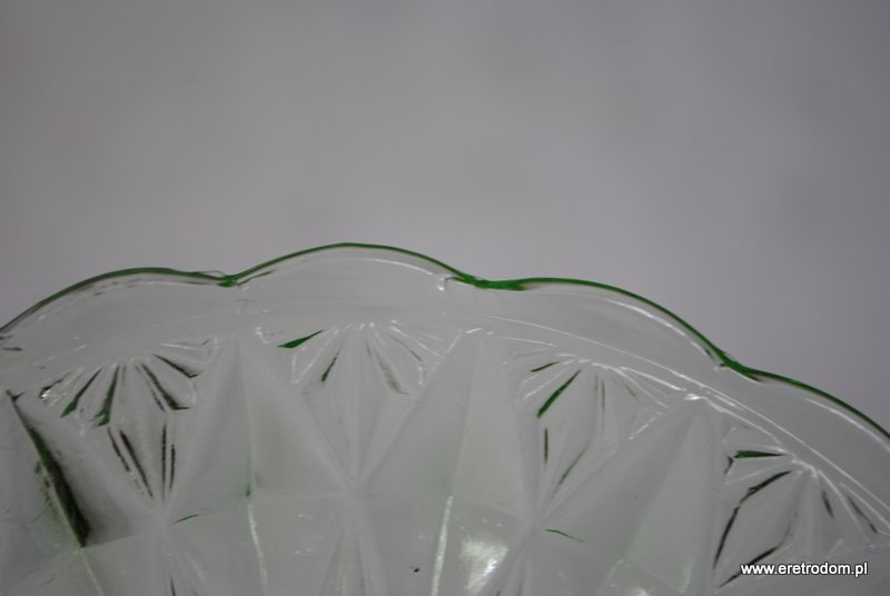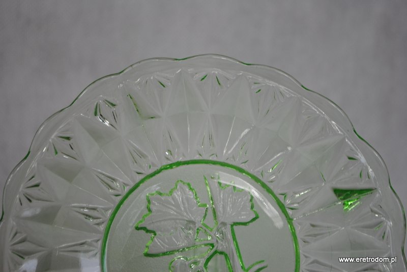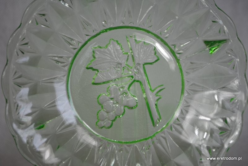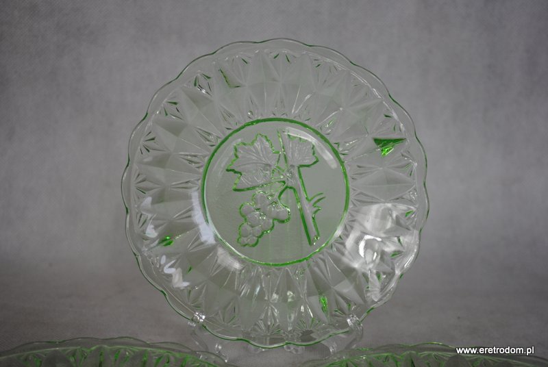 Zestaw 3 talerzyków. Wykonane ze szkła prasowanego barwionego w masie na kolor uranowej zieleni. W centralnej części widnieje kiść winogron,