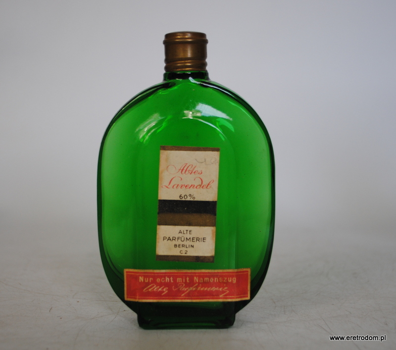 Woda lawendowa, perfum Niemieckiej produkcji z I poł. XXw. (Alte Perfumerie Berlin C.2). Butelka szklana w zielonym kolorze.