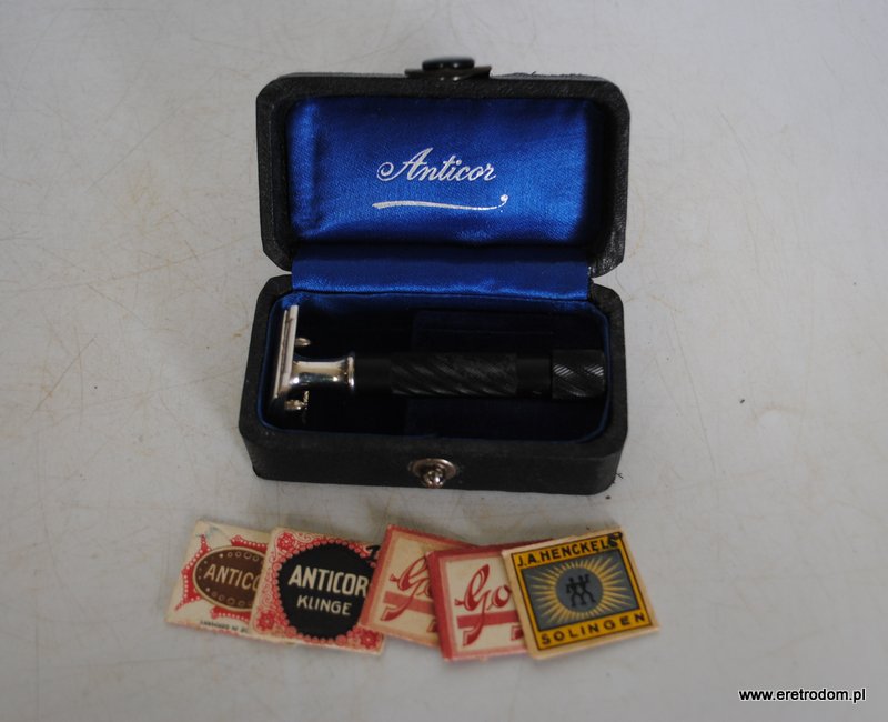 Mini zestaw do golenia firmy Anticor. Maszynka, żyletki oraz oryginalne opakowanie.