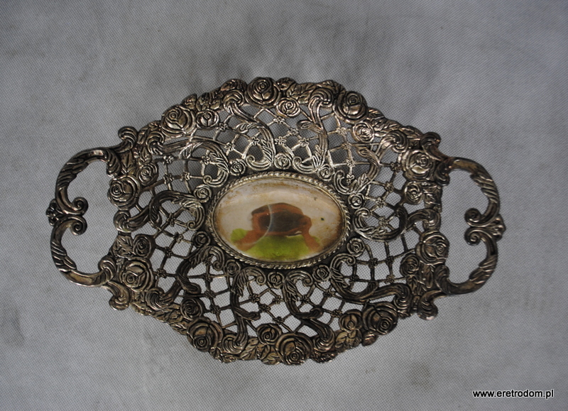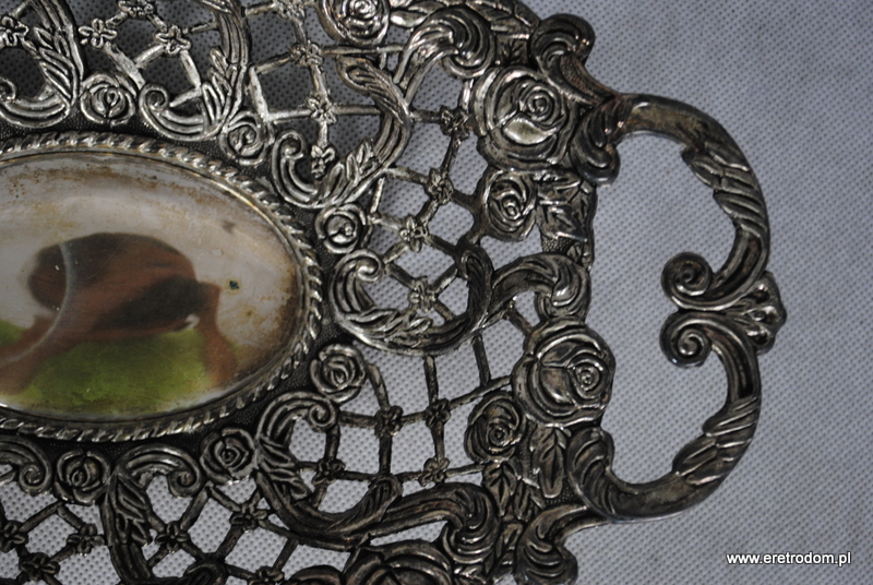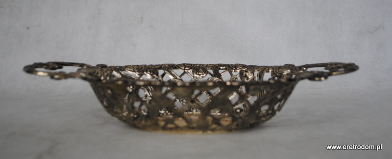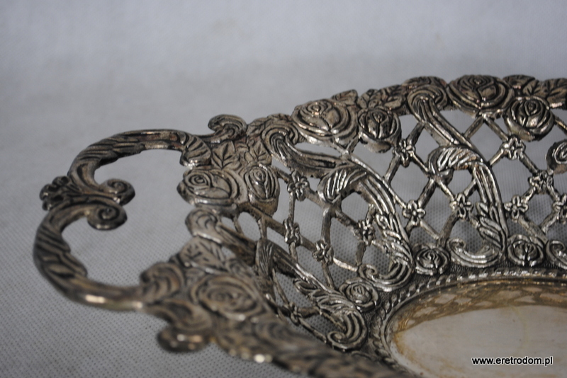 Ażurowy koszyk czy też patera na owoce. Wykonana z metalu pięknie formowanego w różyczki i inne kwiatki. , najprawdopodobniej platerowana.