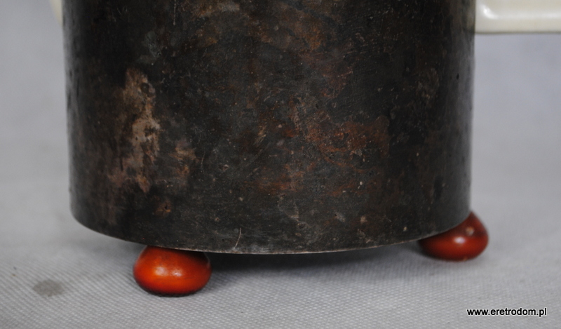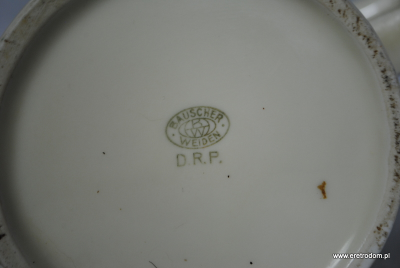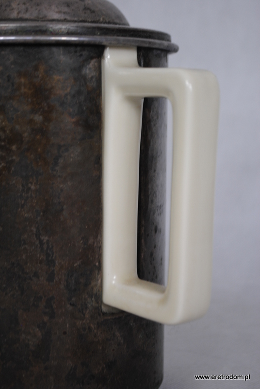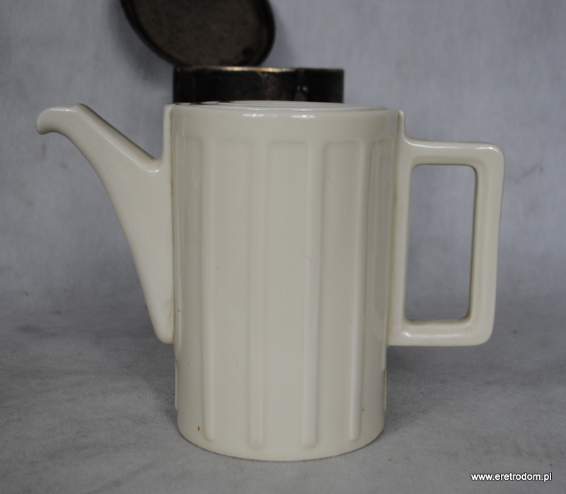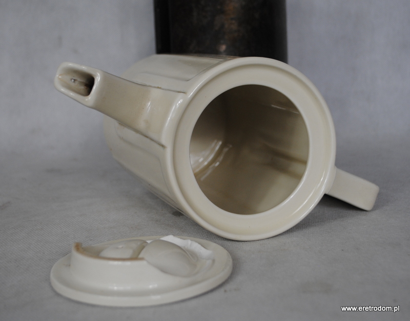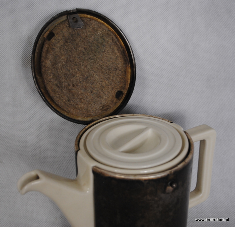 Dzbanek czy też termosniemieckiej firmy Bauscher Wiedn. Metalowe części wykonała firma WMF. Gruba porcelana w kolorze złamanej bieli.