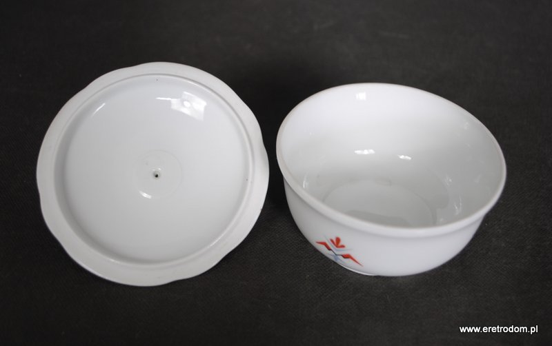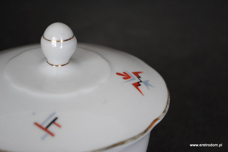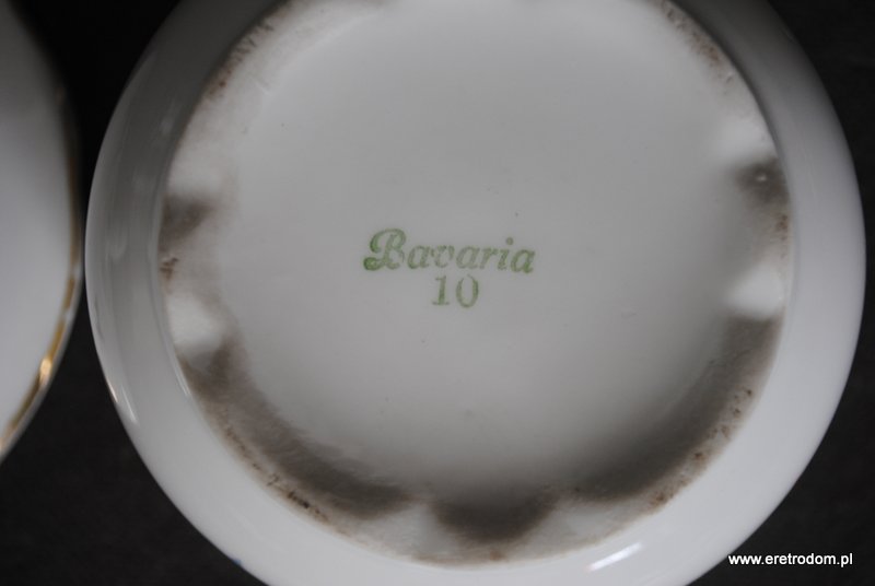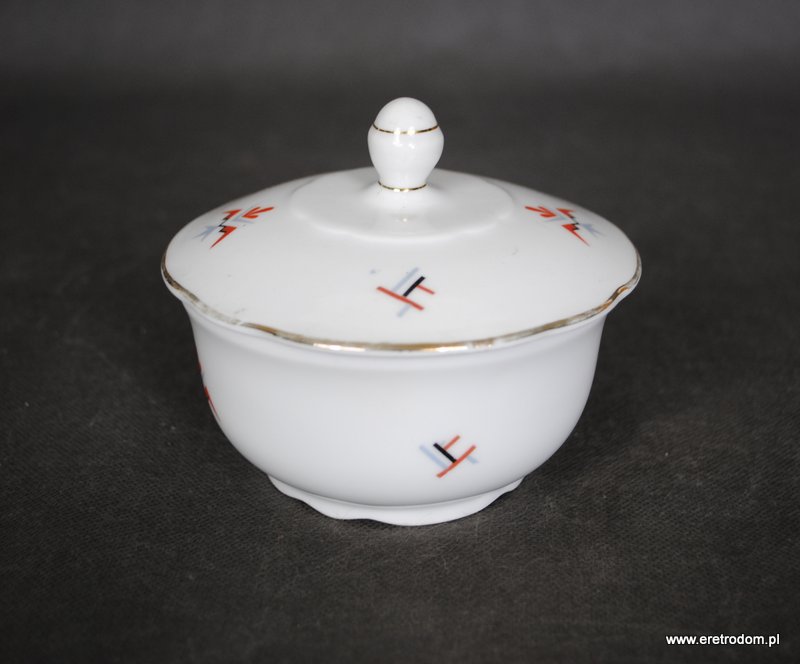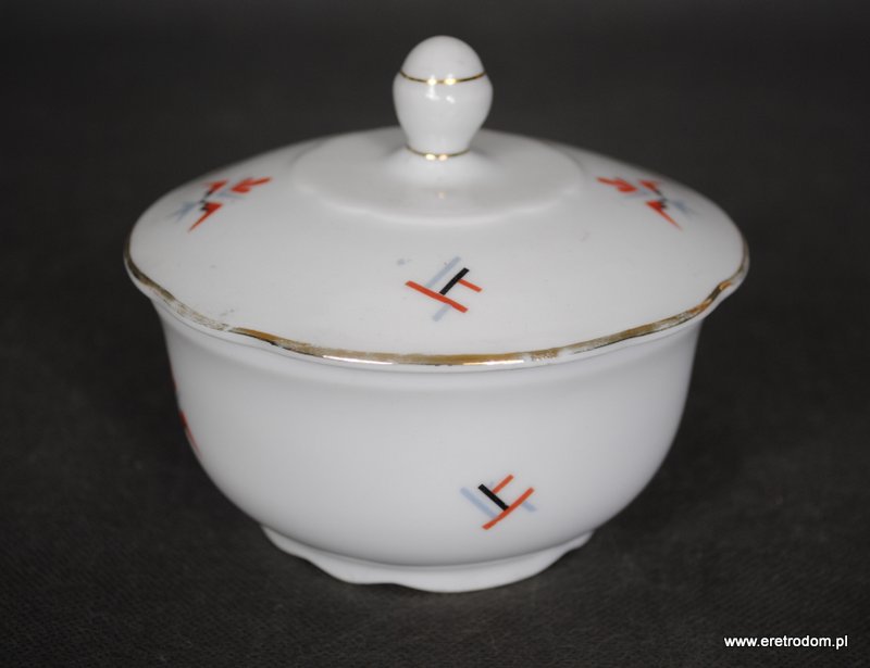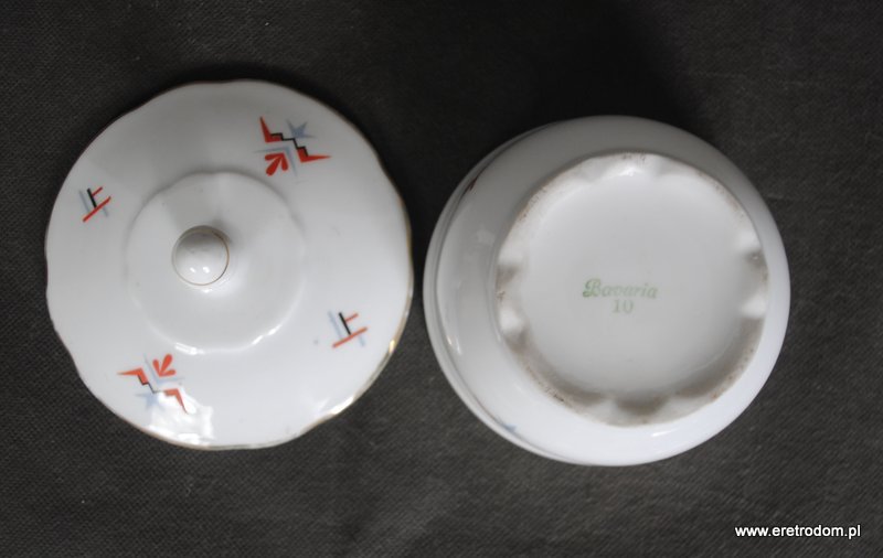Bombonierka wyprodukowana przez jedną z Bawarskich manufaktur. Biała, dość delikatna porcelana ozdobiona geometrycznymi zworkami, złocona.