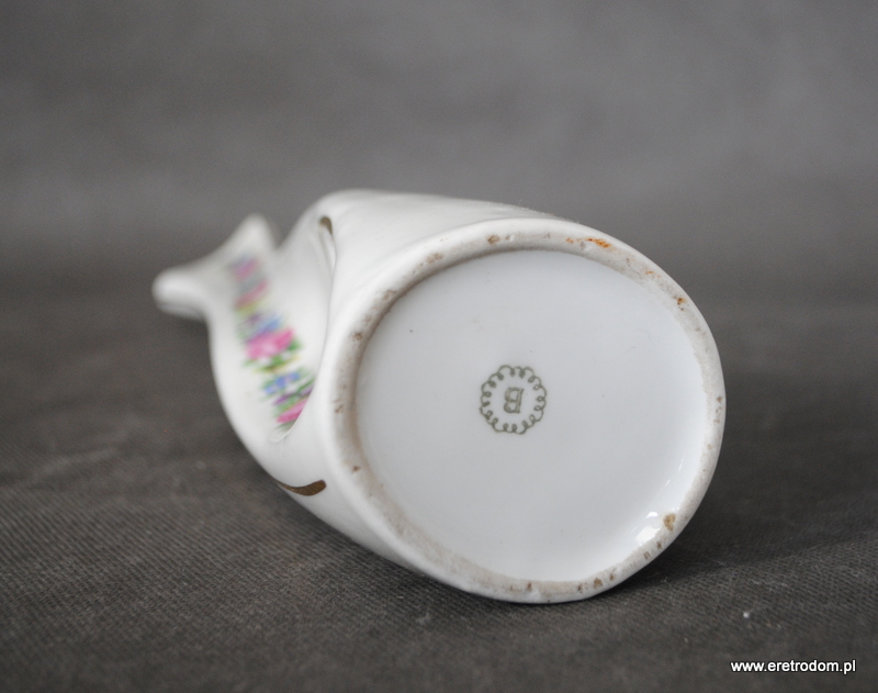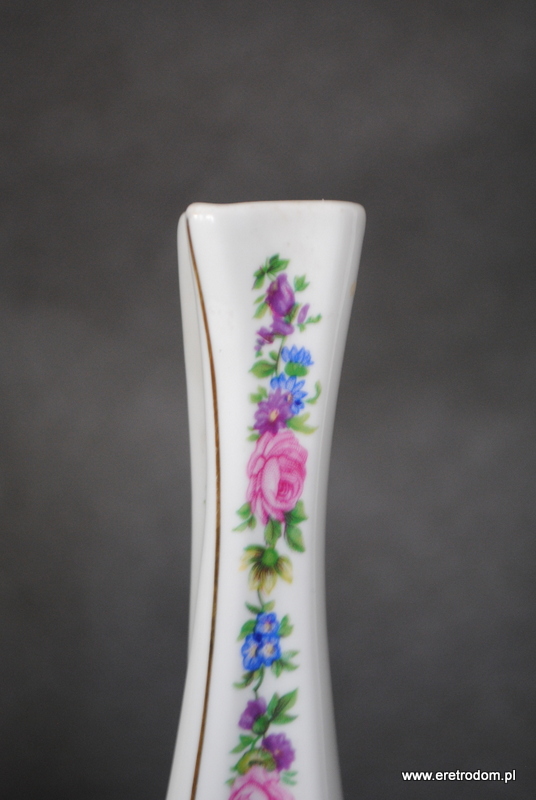 Wazon z dziurką z Zakładów Porcelany Bogucice w Katowicach. Biała porcelana o asymetrycznej formie ozdobiona została pionowymi paskami kwiatów oraz złota.