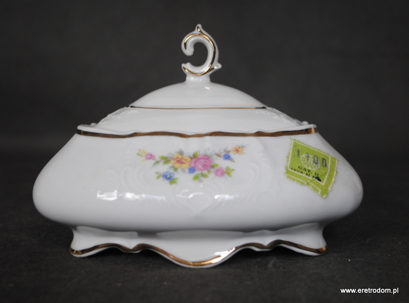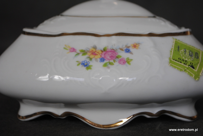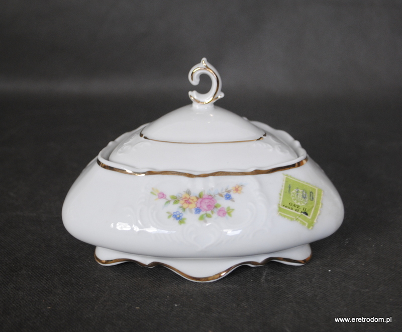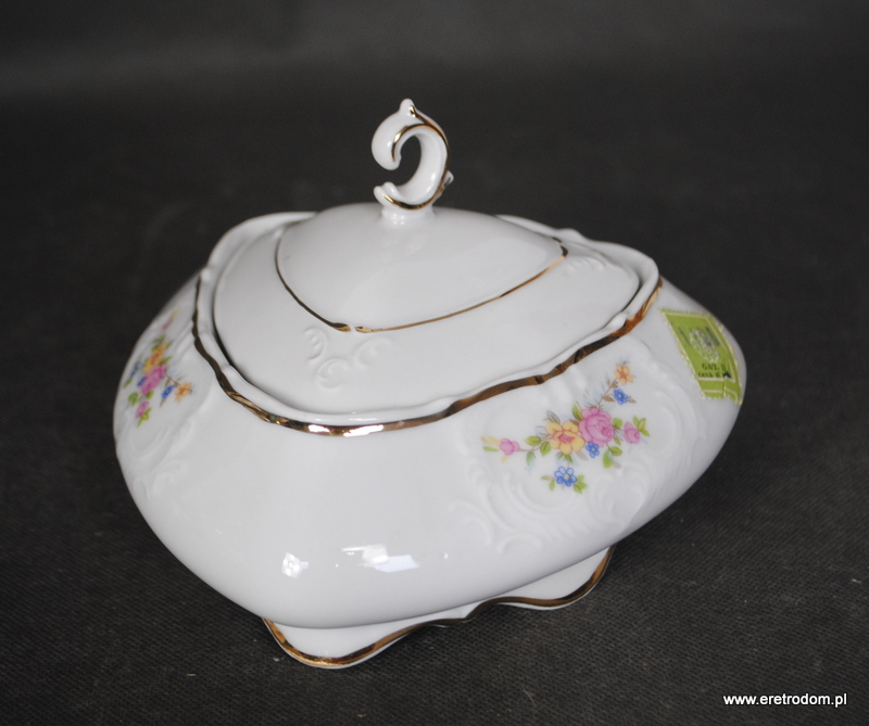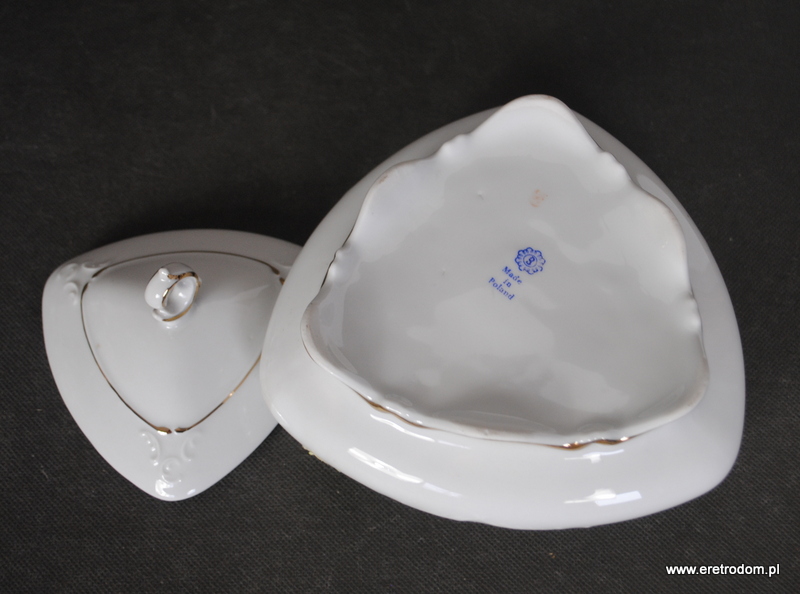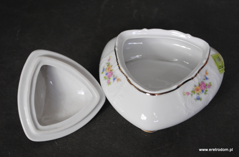 Bomboniera o kształcie trójkąta. Bogucice, II poł. XXw. Biała porcelana ozdobiona motywem kwiatowym, złocona. Posiada metkę producenta.
