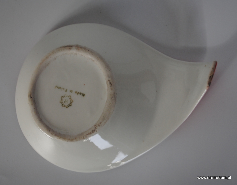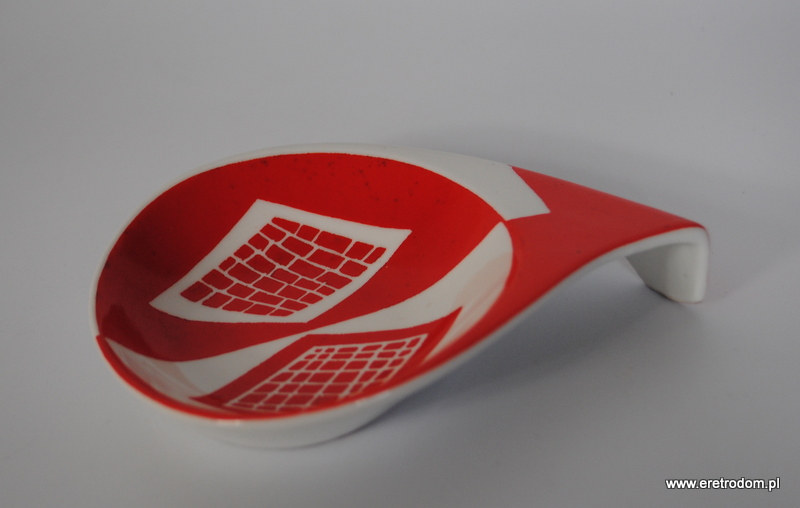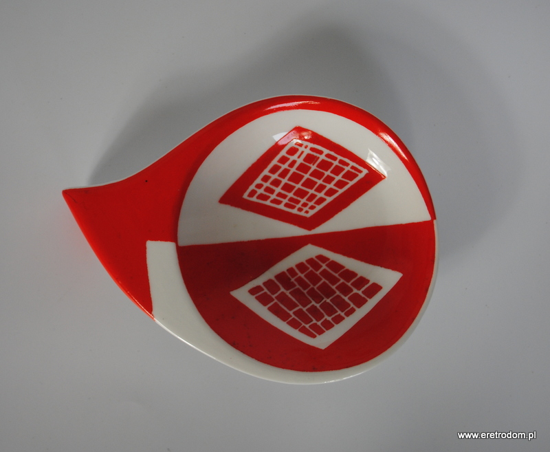 Popielniczka zaprojektowana przez Erykę Trzewik-Drost dla Bogucic ( lata 50-60 XXw.).  Biała porcelana malowana na czerwony kolor, ozdobiona metodą drapaną. Od spodu sygnatura producenta.