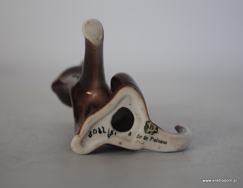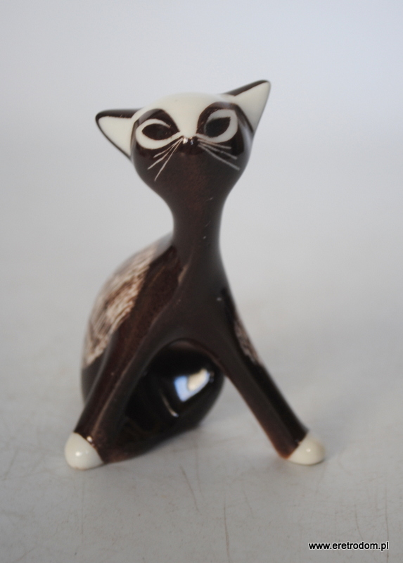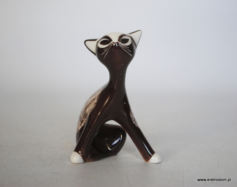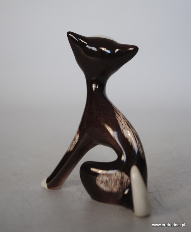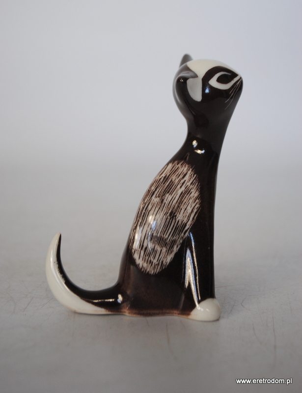 Figurka przedstawiająca kota siedzącego. Sygnowany Bogucice, . Biała porcelana malowana natryskowo na kolor brązowy, malatura wybierana.