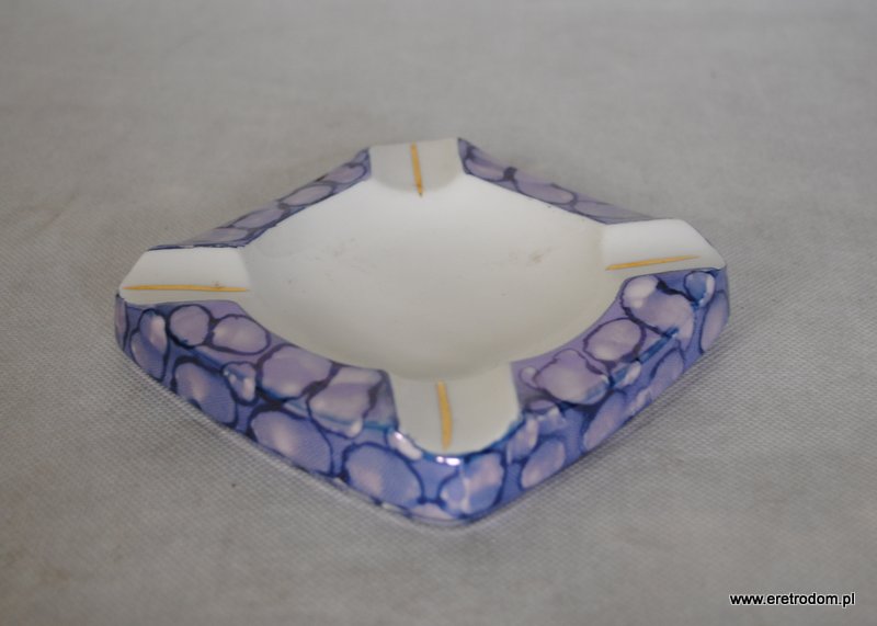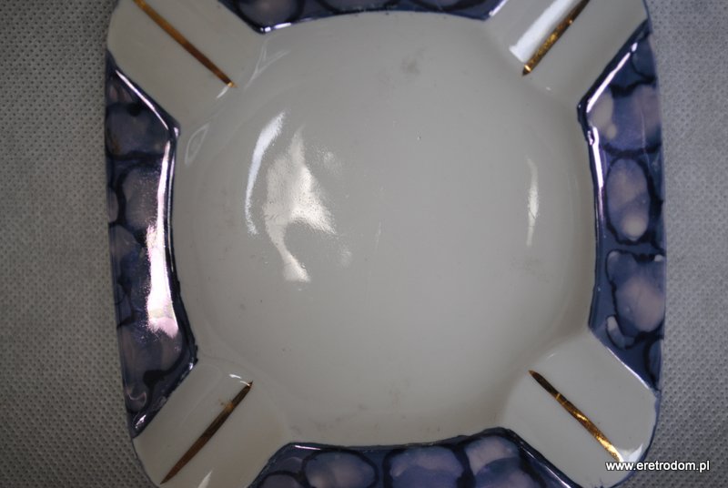 Popielniczka wyprodukowana w Bogucicach. Biała porcelana ozdobiona niebieskim zdobieniem- marmurkiem oraz złotymi paseczkami.