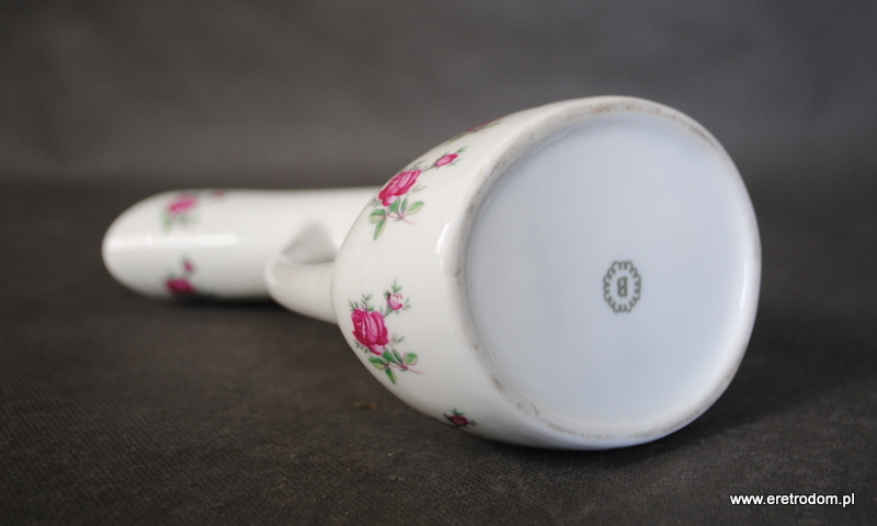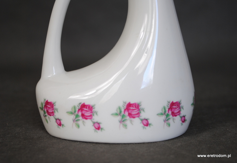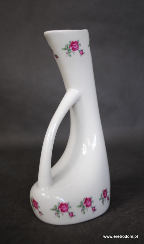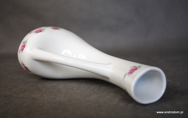 Wazon sygnowany Bogucice. Projekt Henryk Baran, lata 50. Biała porcelana, ozdobiona różyczkami.