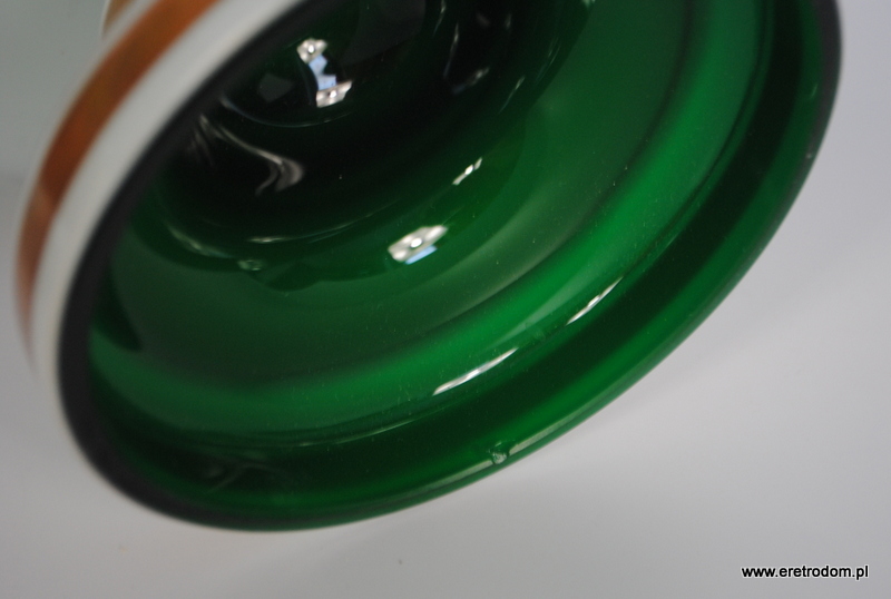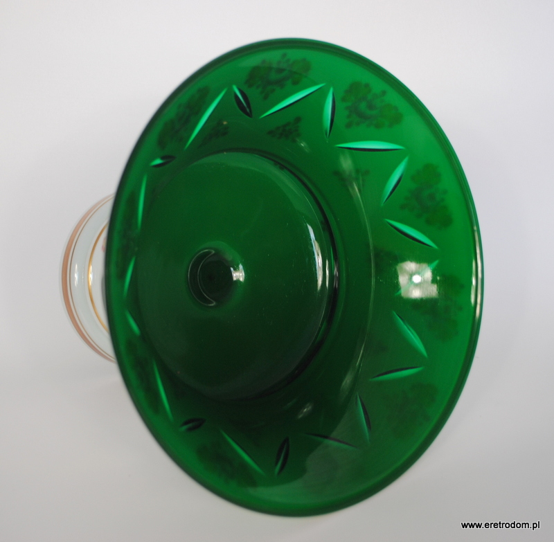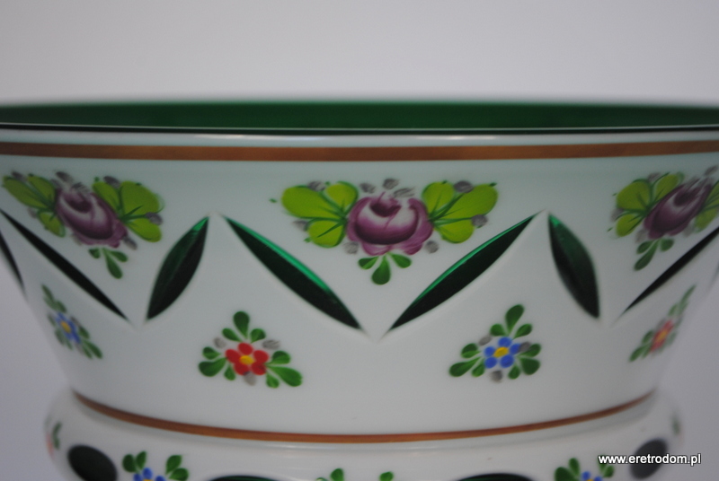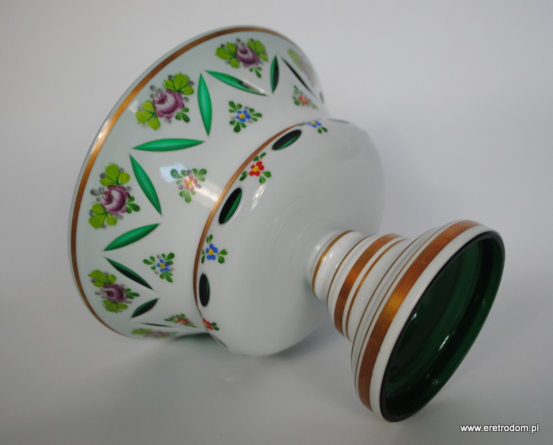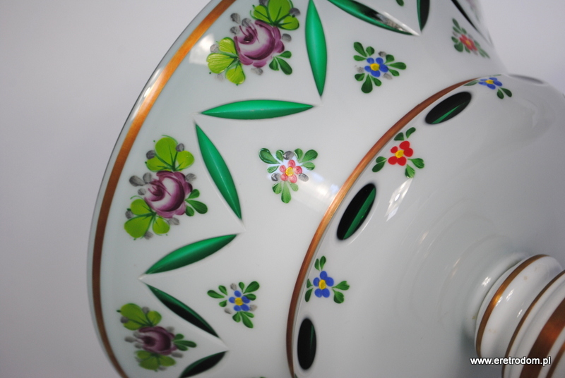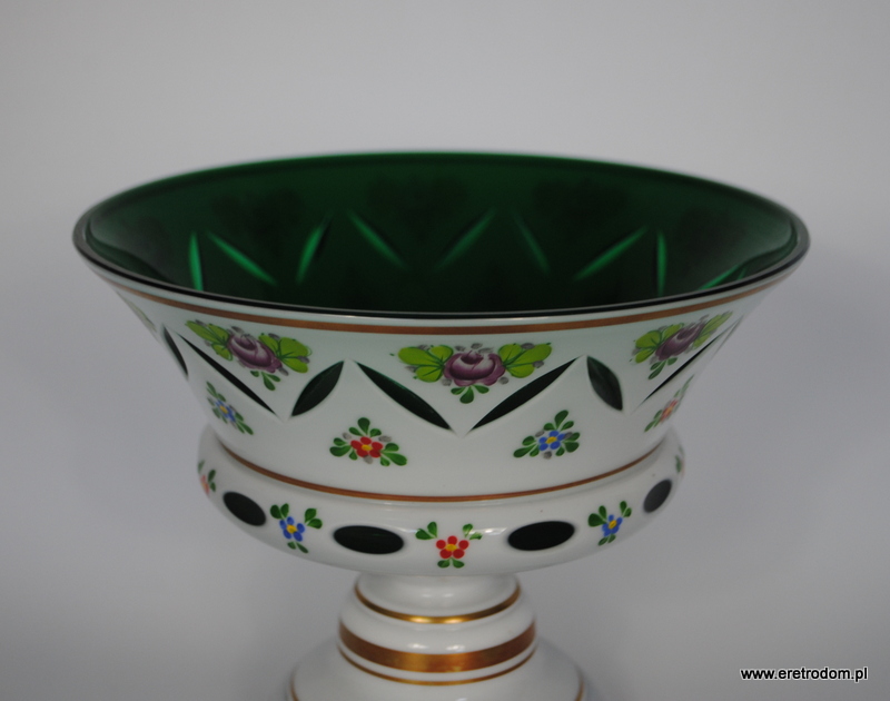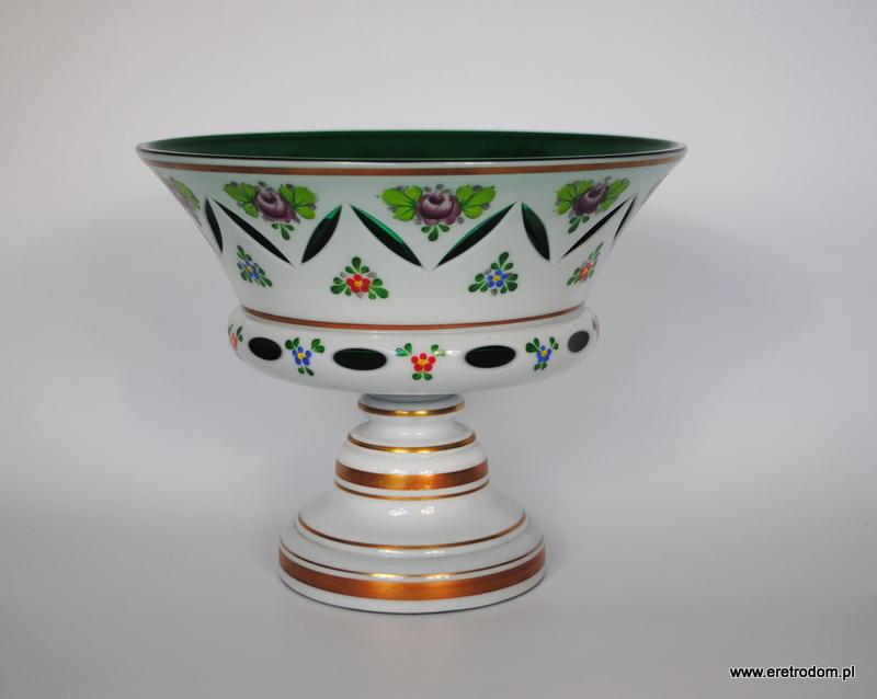 Misa czy też owocarka na nodze, Bohemia. Szkło dwuwarstwowe, wybierane, w środku zielone, zewnątrz w białym kolorze. Ręczna malatura i złocenia.