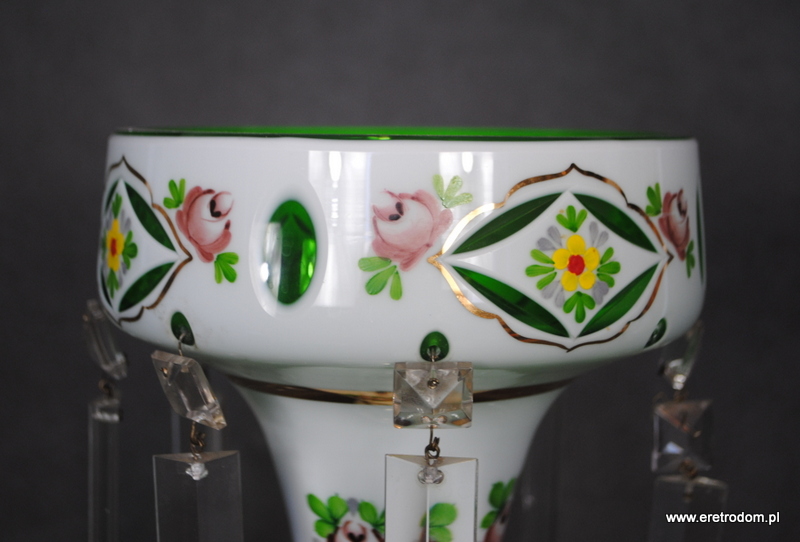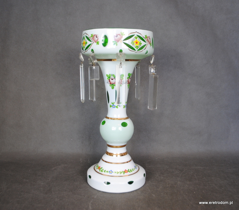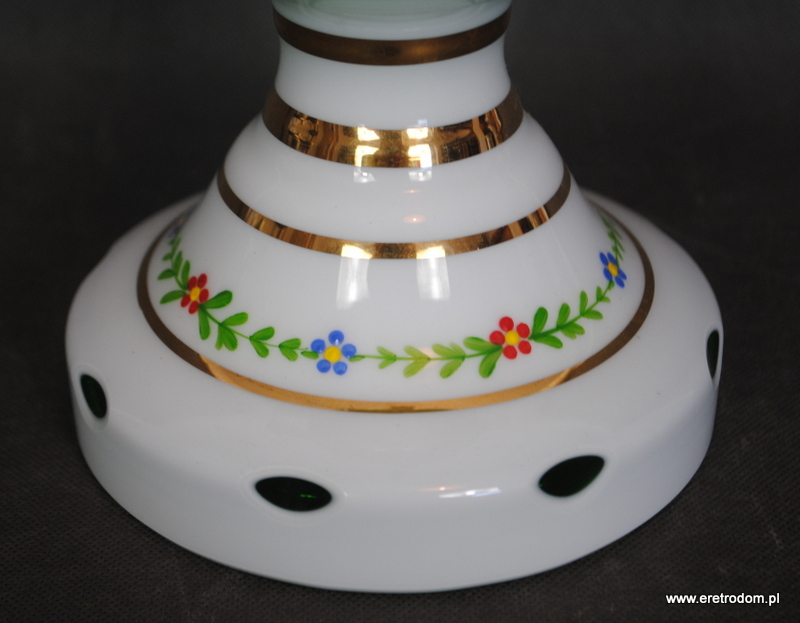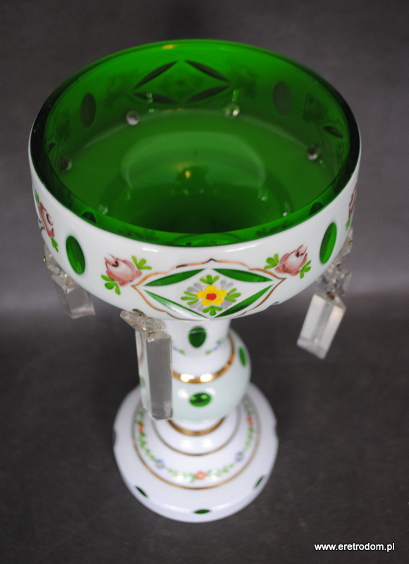 Świecznik czy też wazon, Bohemia. Szkło dwuwarstwowe, wybierane, w środku zielone, zewnątrz w białym kolorze. Ręczna malatura i złocenia. Wokół czaszy posiada bezbarwne wisiorki.
