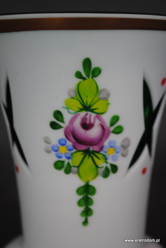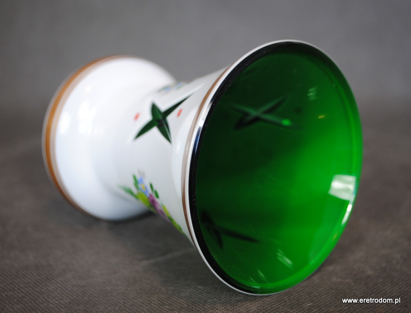 Wazon, Bohemia. Szkło dwuwarstwowe, wybierane, w środku zielone, zewnątrz w białym kolorze. Ręczna malatura i złocenia.