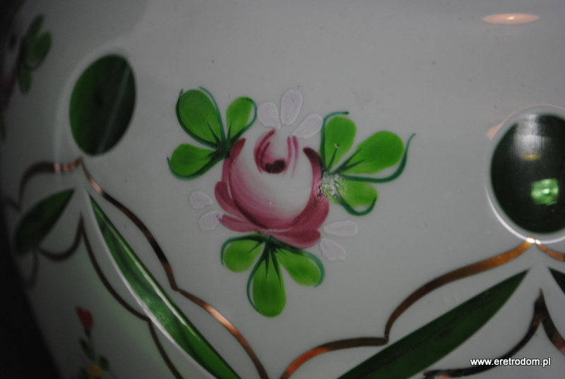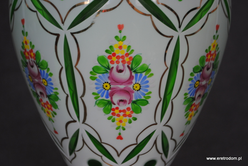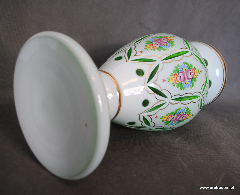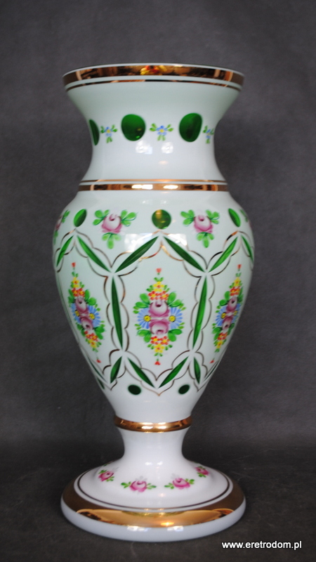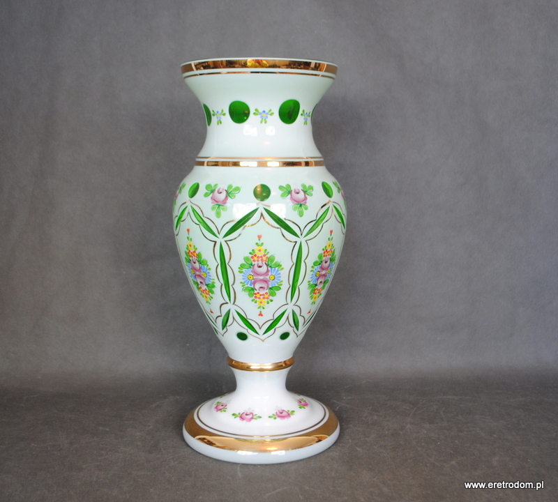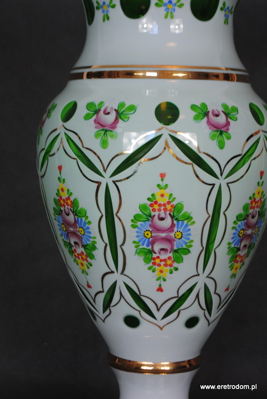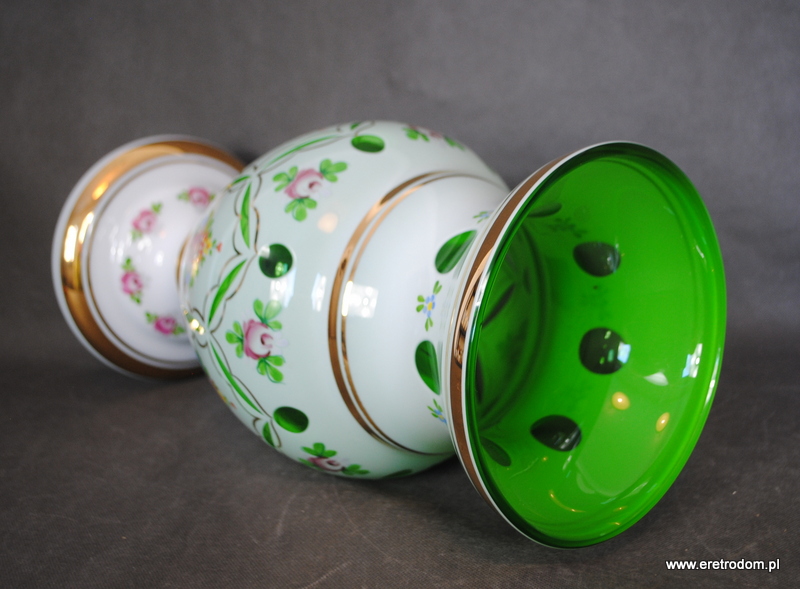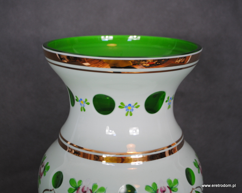 Okazały wazon, Bohemia. Szkło dwuwarstwowe, wybierane, w środku zielone, zewnątrz w białym kolorze. Ręczna malatura i złocenia.