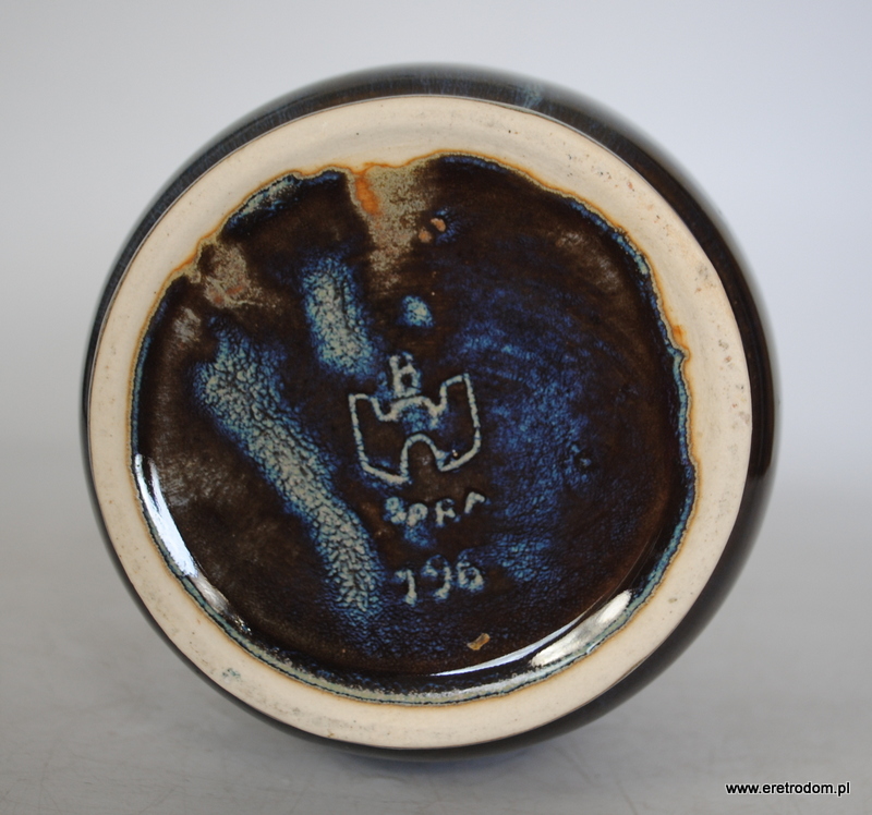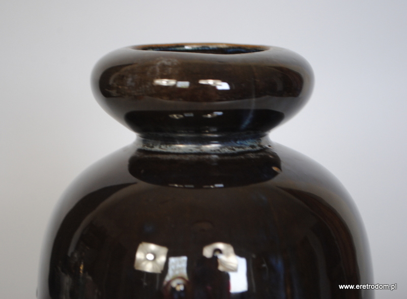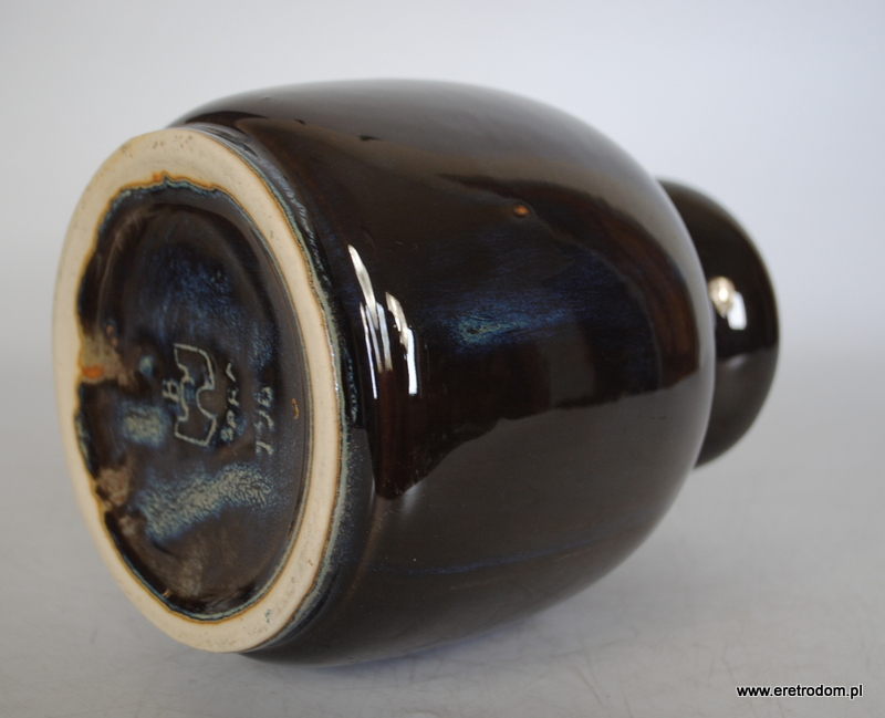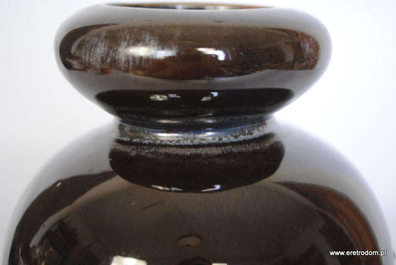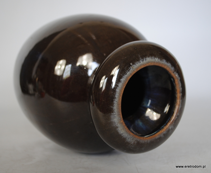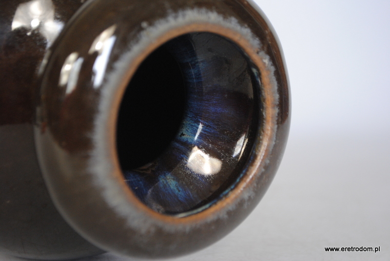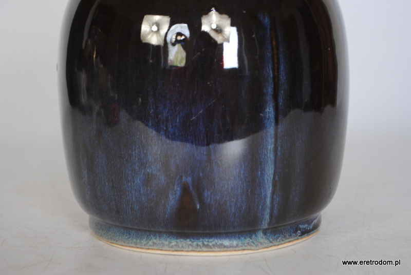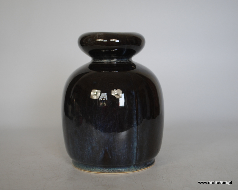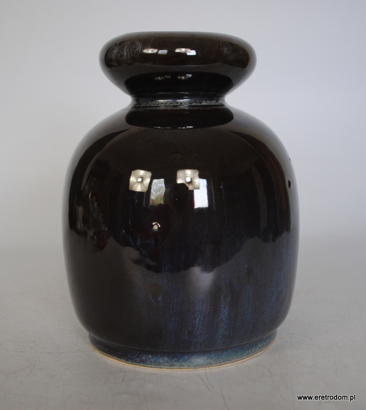 Atrakcyjny wazon, proj. B. Wolanin dla Bolesławca. Ceramika szkliwiona na ciemny kolor pięknie przełamana niebieskimi smugami.