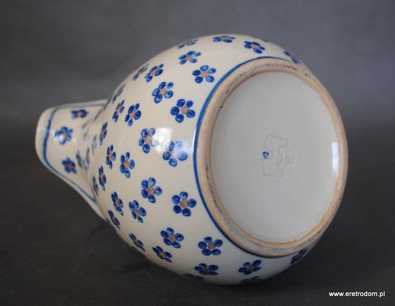 Dzbanek na mleko, produkcja Bolesławiec. Ceramika w kremowym kolorze, ręcznie malowana w kwiatuszki. Przy rancie oraz na uchu kreska.