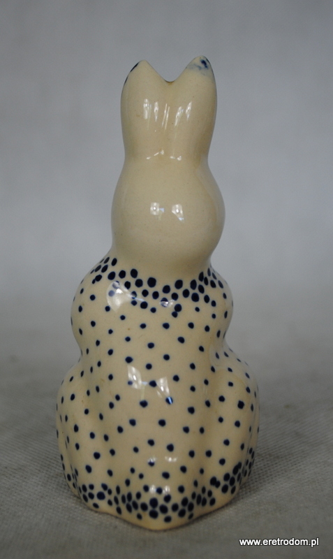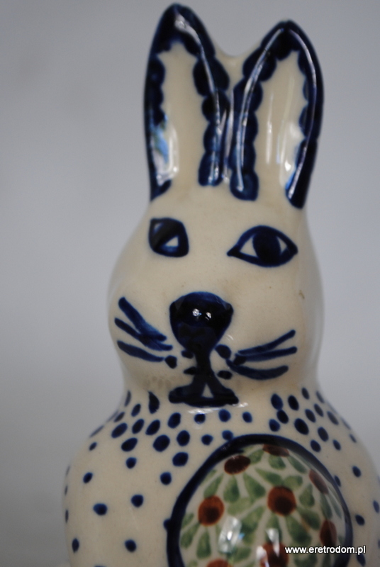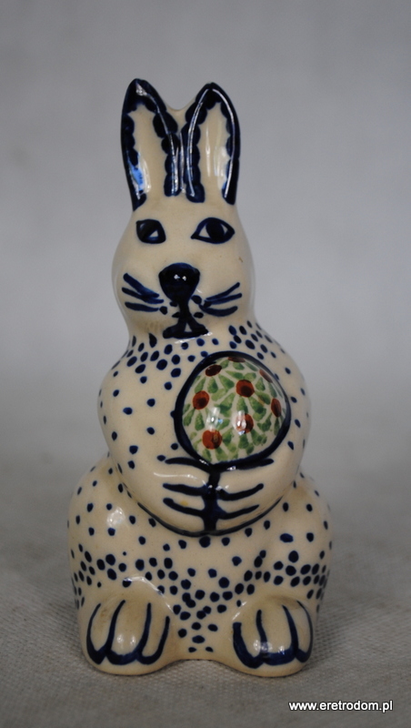 Figurka przedstawiająca zająca wyprodukowana w Bolesławcu. Ceramika w kolorze śmietanki, ręcznie malowana.