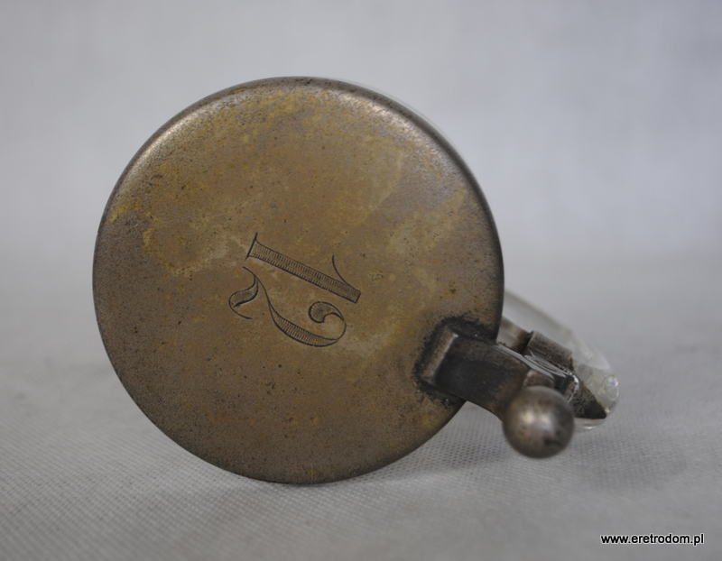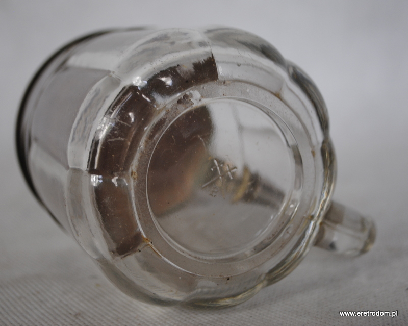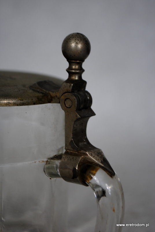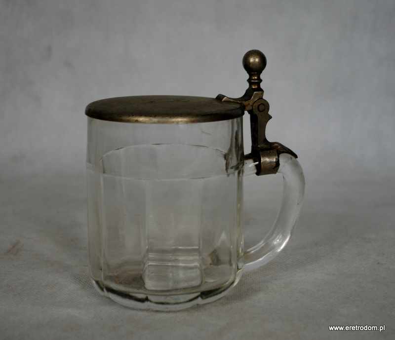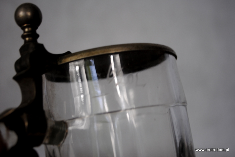 Stareńki szklany kufel sygnowany (Huta szkła Brockwitz). Pojemność 6/20l .Ciężkie szkło, od spodu wytopiony znak dwóch mieczy. Klapka cynowa, na wieku grawer cyfry 12.