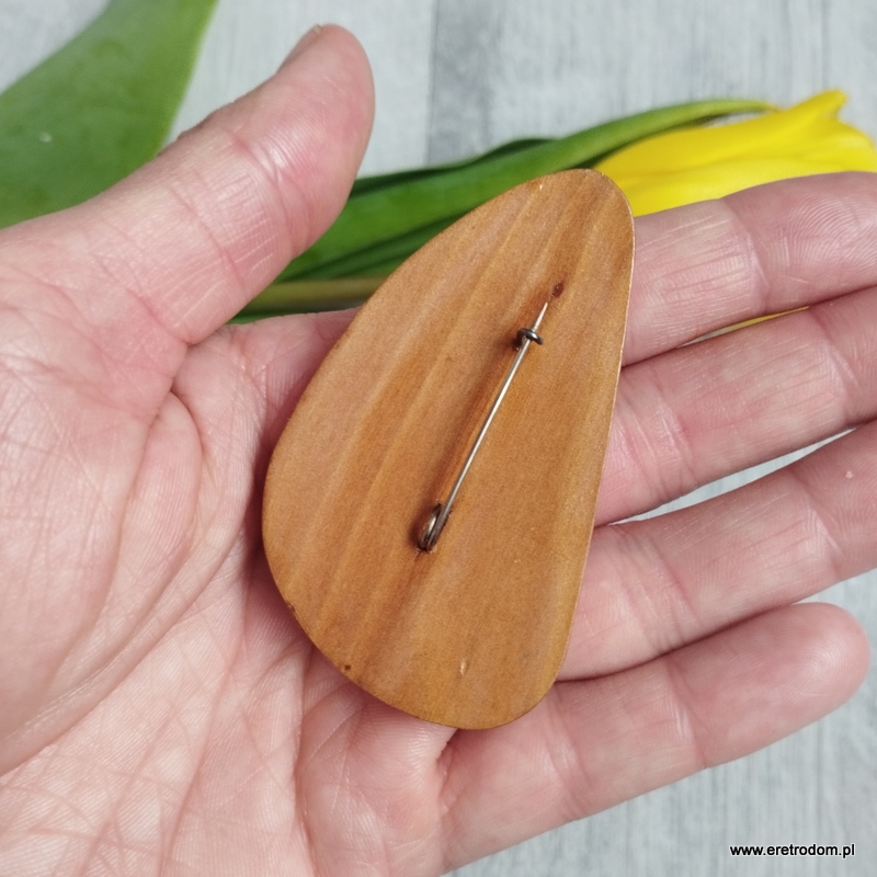 Broszka wykonana z drewna. Ozdobiona masą perłową i koralikami.