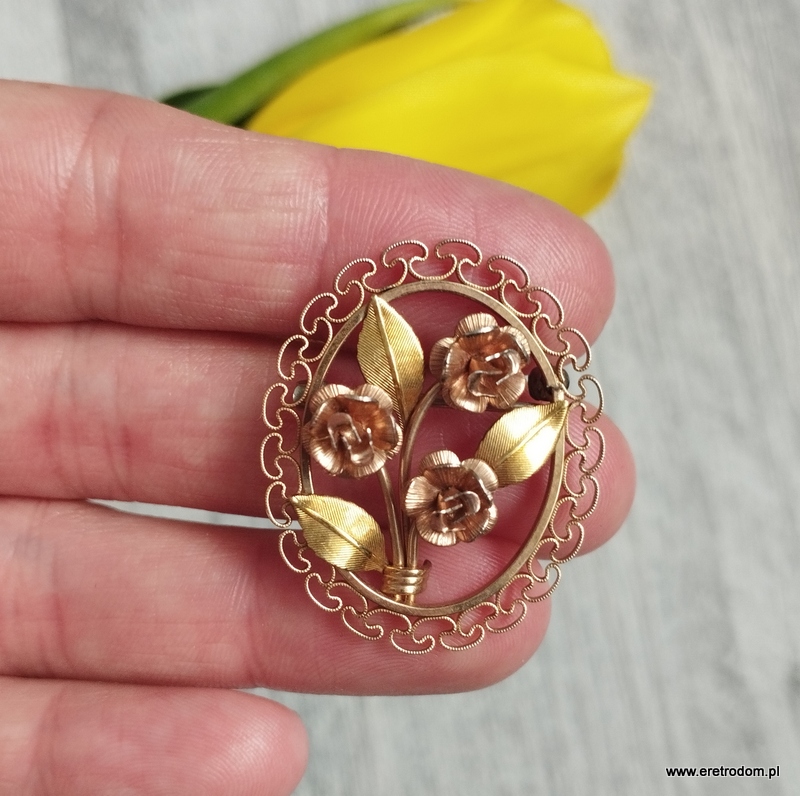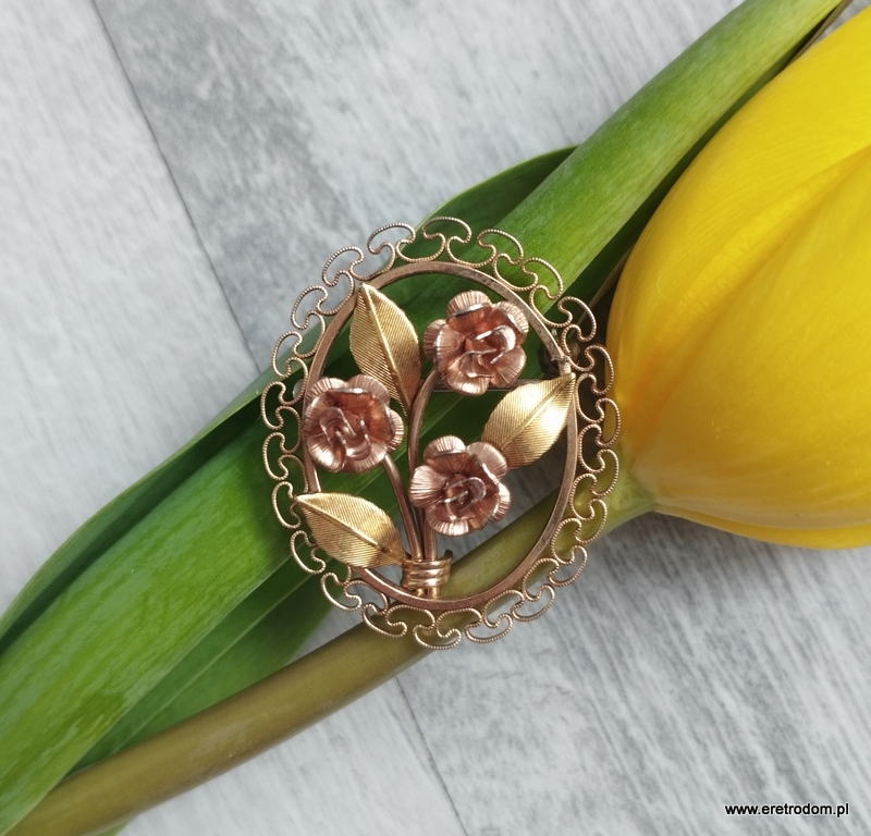Broszka wykonana z mosiądzu . Delikatny bukiecik kwiatków w owalnej otoczce.