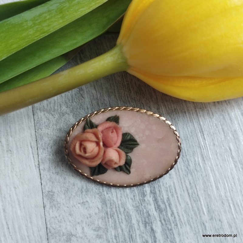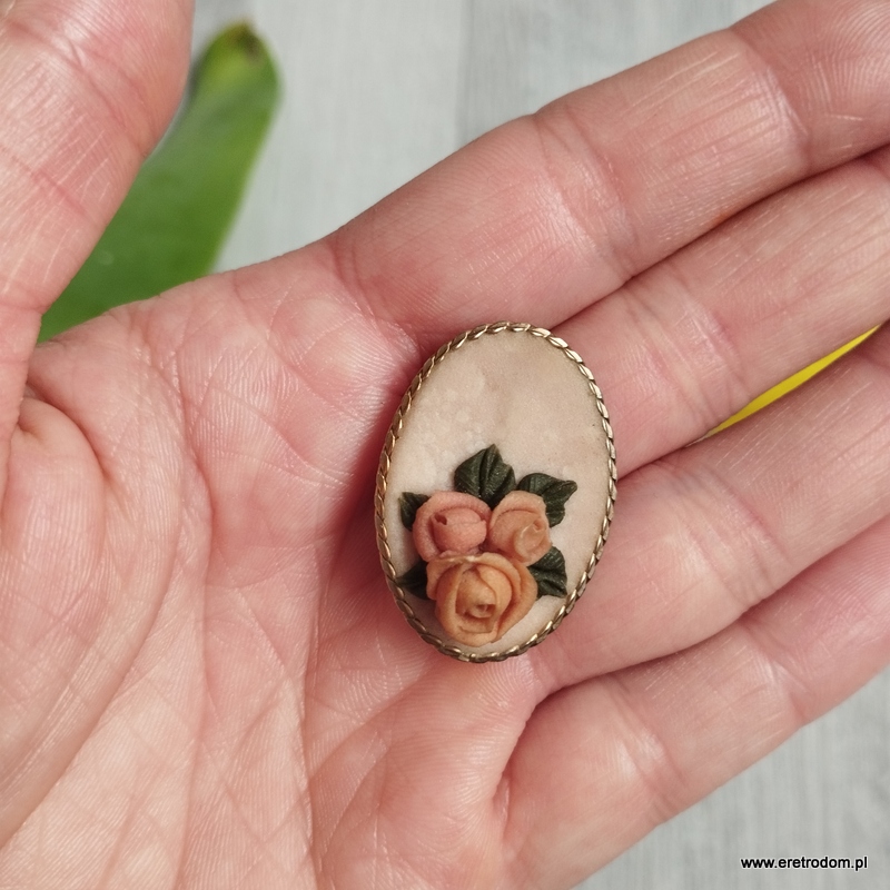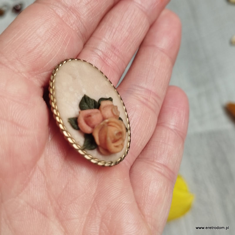 Broszka wykonana z mosiądzu. W centralnej części kwiatki wykonane z plastycznej masy.