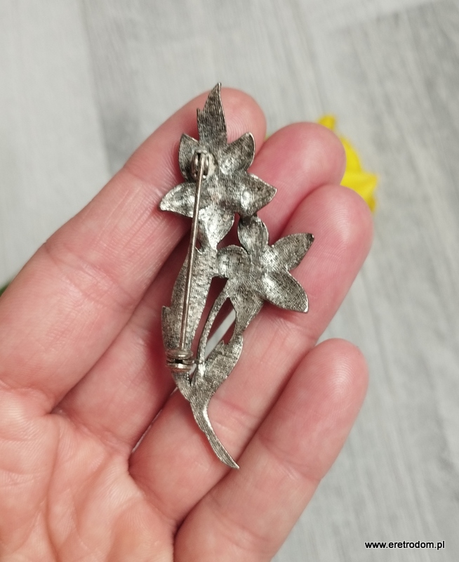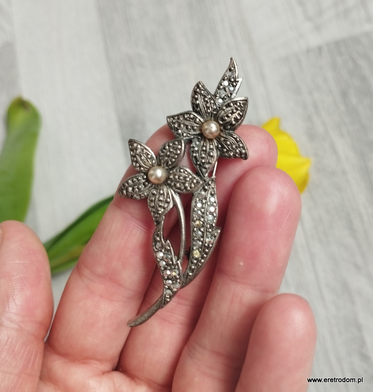 Broszka w kształcie kwiatków wykonana z metalu. Ozdobiona kamyczkami.