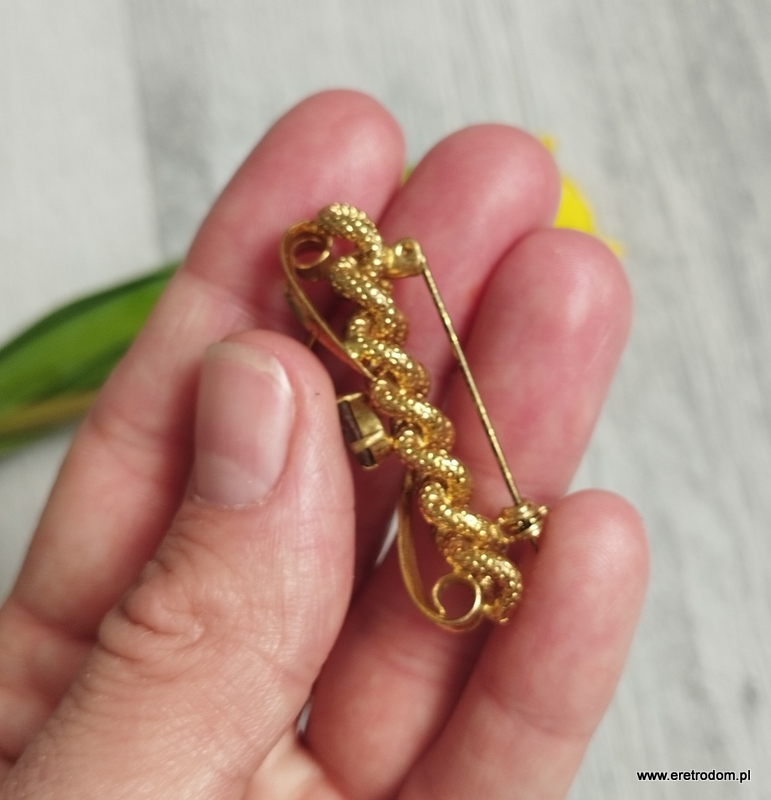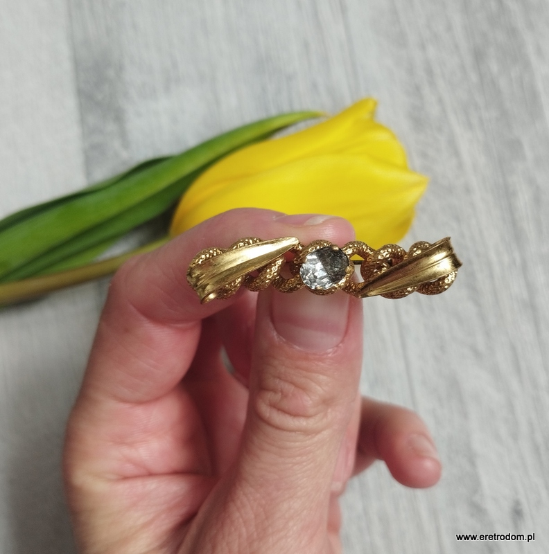 Broszka wykonana z mosiądzu lub złoconego metalu. Plecionka ozdobiona dwoma listkami i bezbarwnym oczkiem.