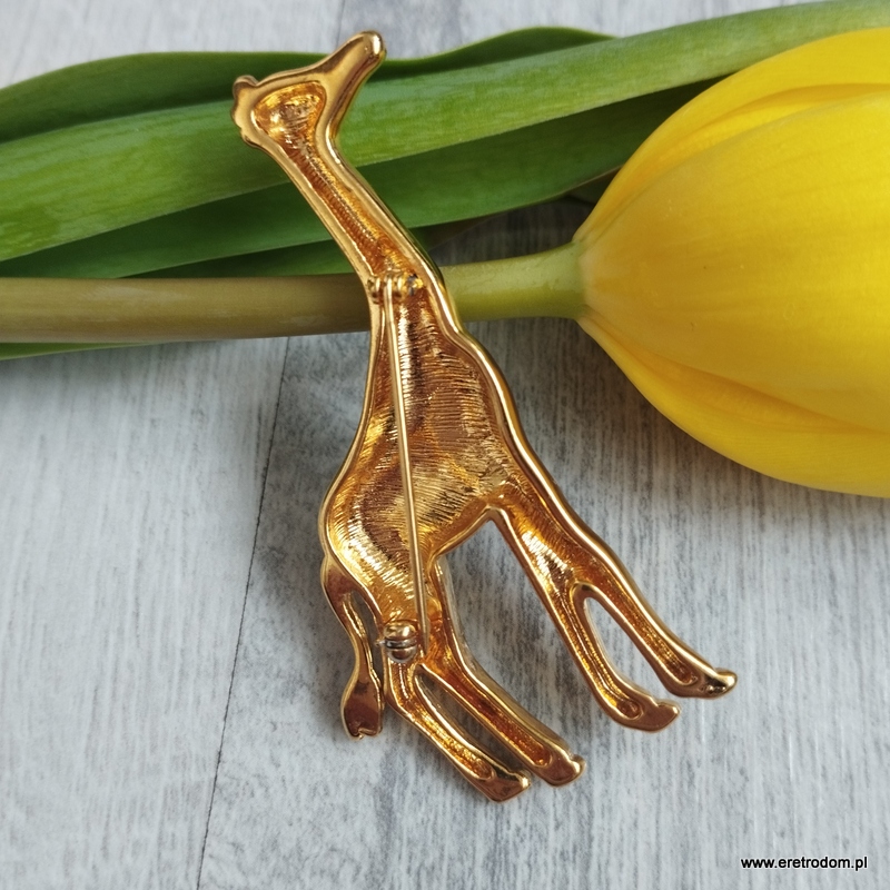 Broszka żyrafa wykonana z metalu, pozłacana. Malowana emalią.