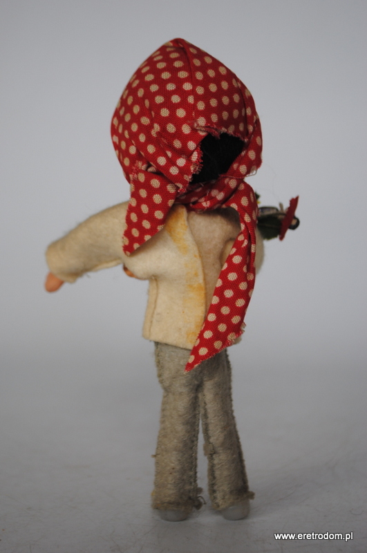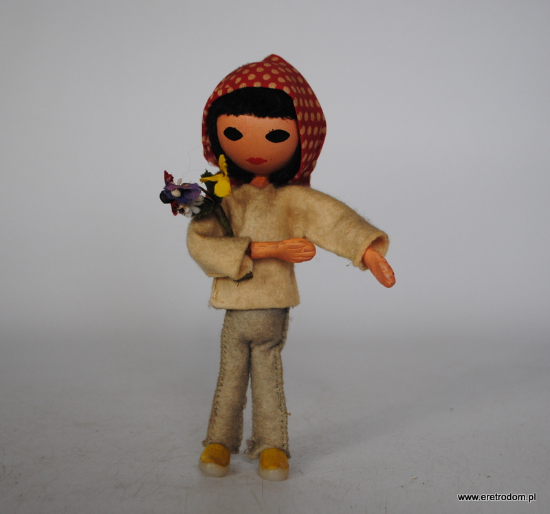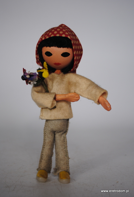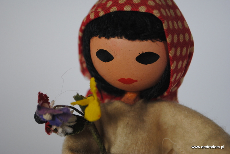 Laleczka z kwiatami. Cepelia, II poł. XXw. Głowa drewniana, ręce najprawdopodobniej są porcelanowe a stopy szklane.