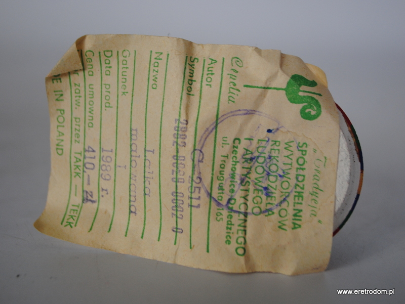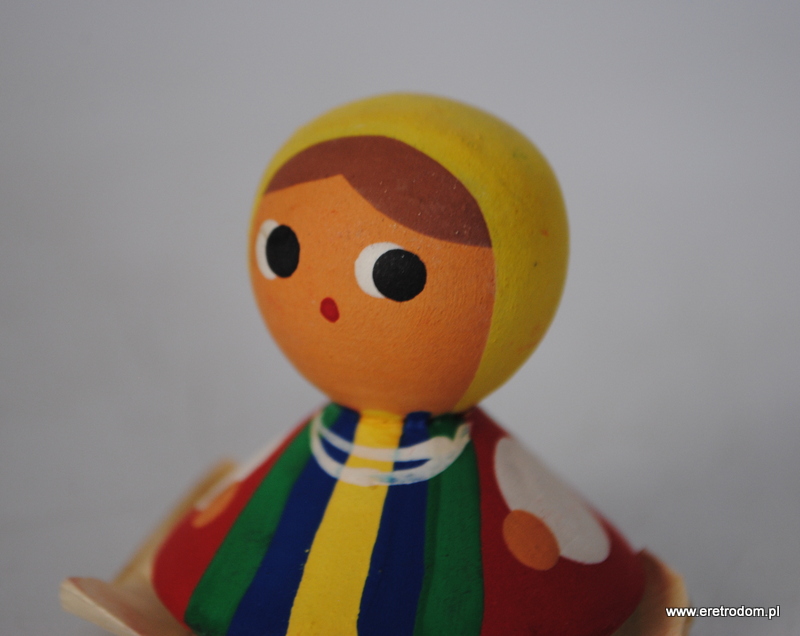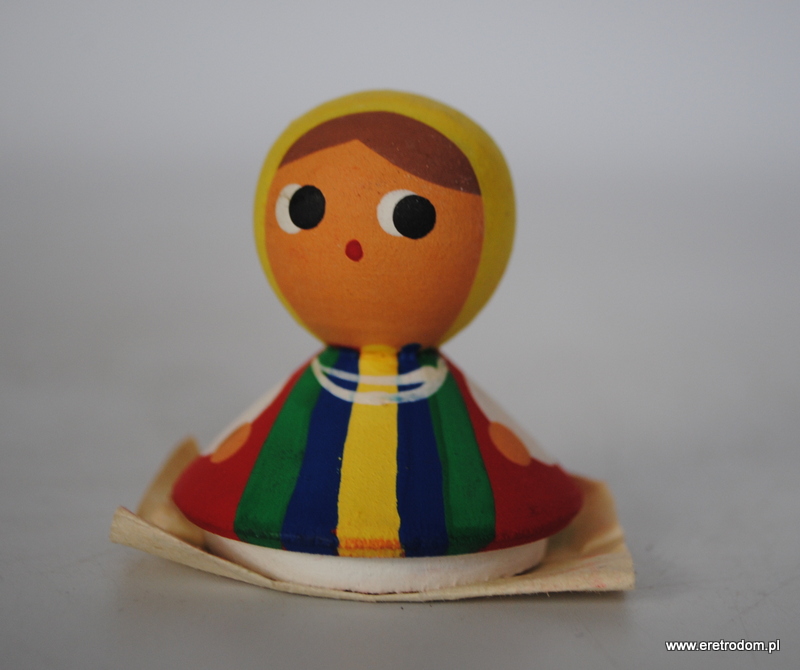 Laleczka w stroju ludowym. Cepelia, Sp. „Tradycja”, Czechowice-Dziedzice, II poł. XXw. Drewniana, ręcznie malowana. Posiada metkę.