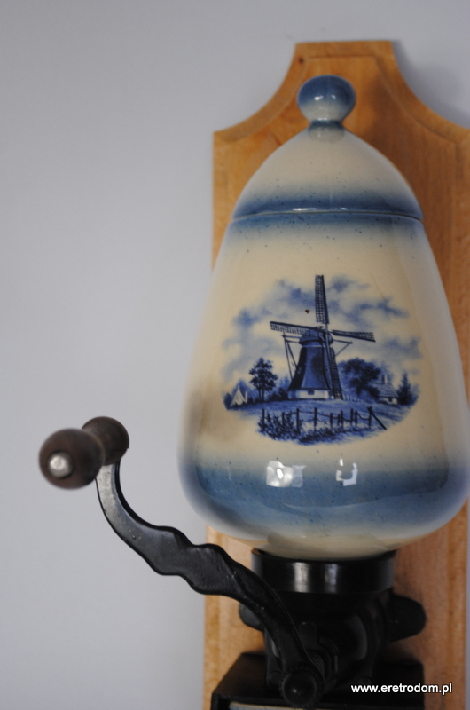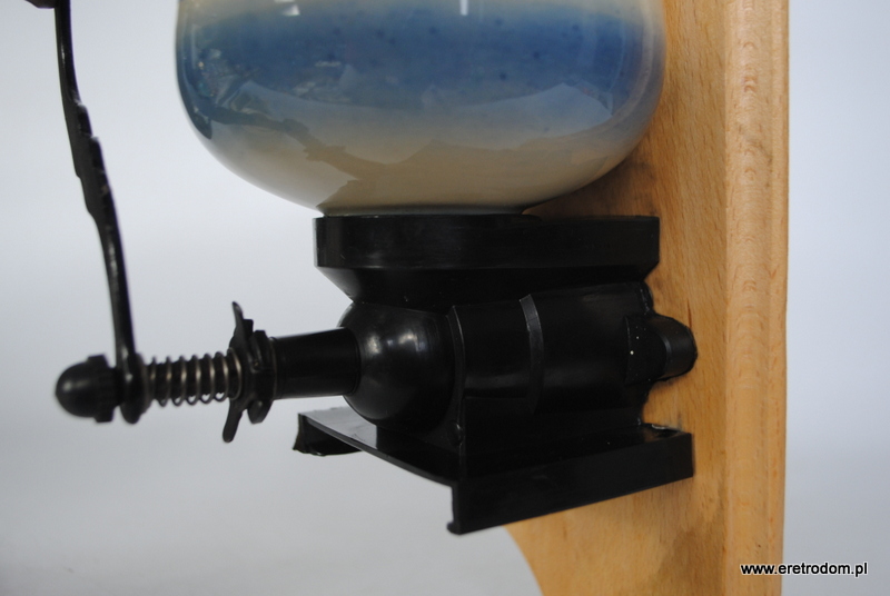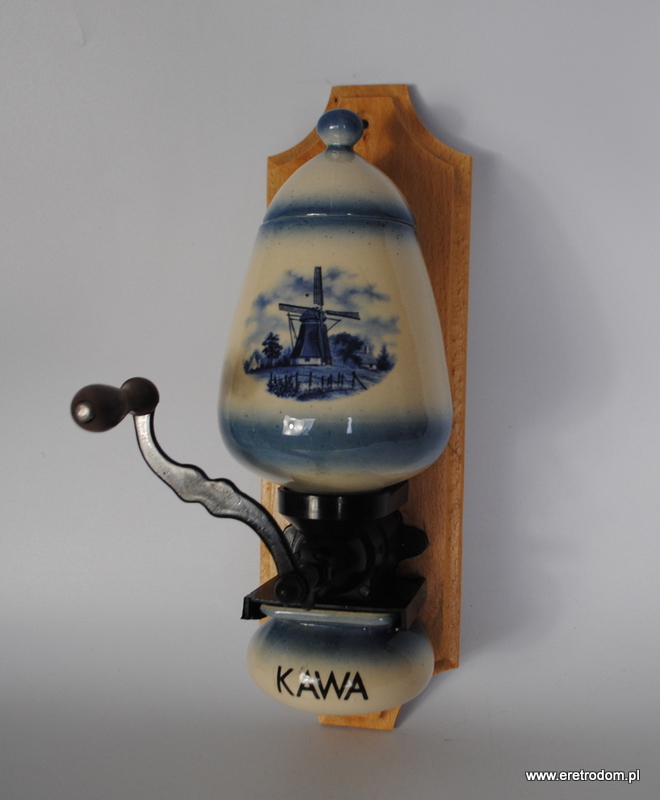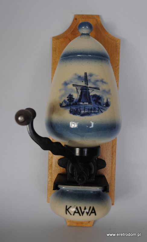 Ceramiczny młynek do kawy. Polska produkcja z II poł. XXw. Ceramika na desce, mechanizm plastikowy. Młynek sprawny.