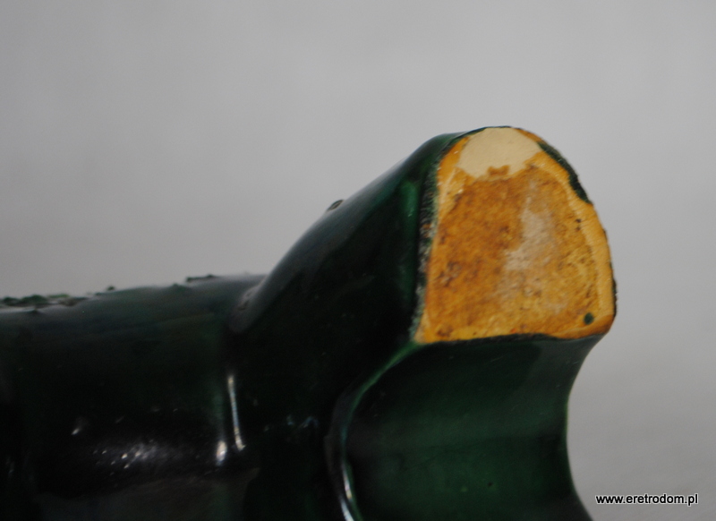 Świecznik nazywany „Trojak”. Produkcja Ceramika Białystok. Ciekawa forma z wypustkami szkliwi0ona na zielony kolor.