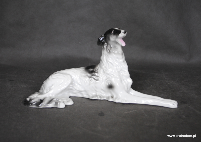 Figurka przedstawiająca charta. Wyprodukowana w II poł. XXw. w jednej z polskich manufaktur. Biała porcelana ręcznie malowana.