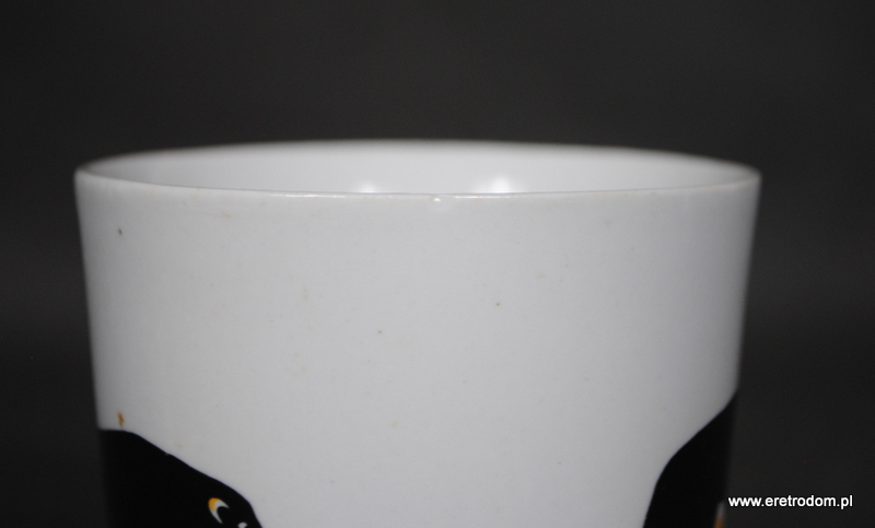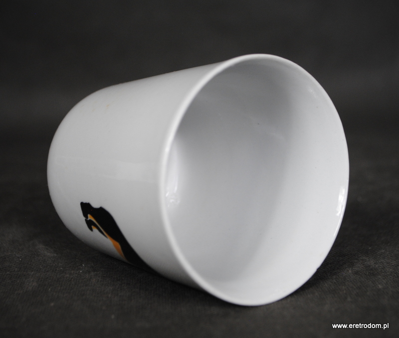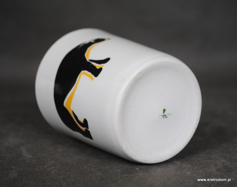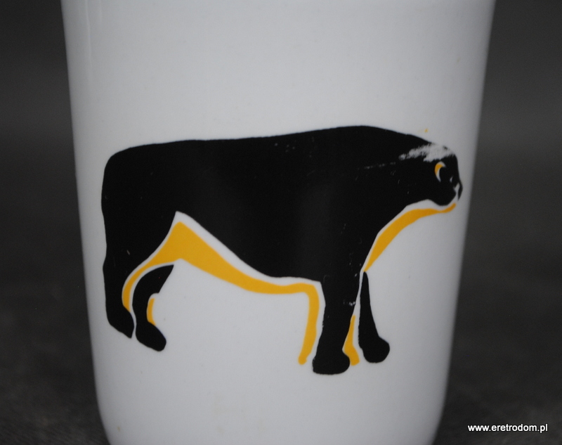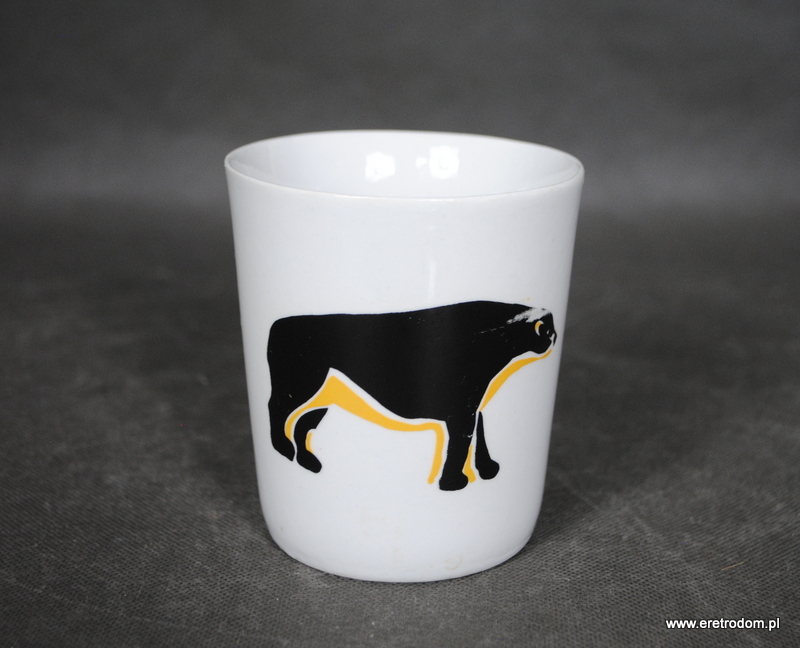 Kubek wyprodukowany w Chodzieży. Biała, dość gruba porcelana ozdobiona motywem zwierzęcym. Od spodu sygnatura numeryczna.