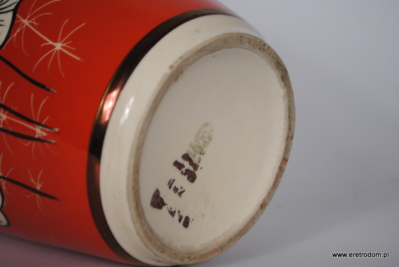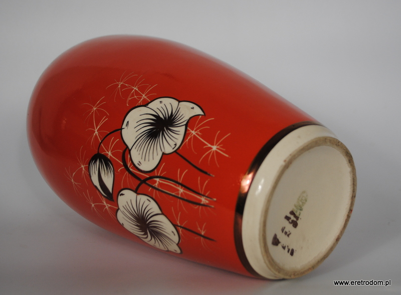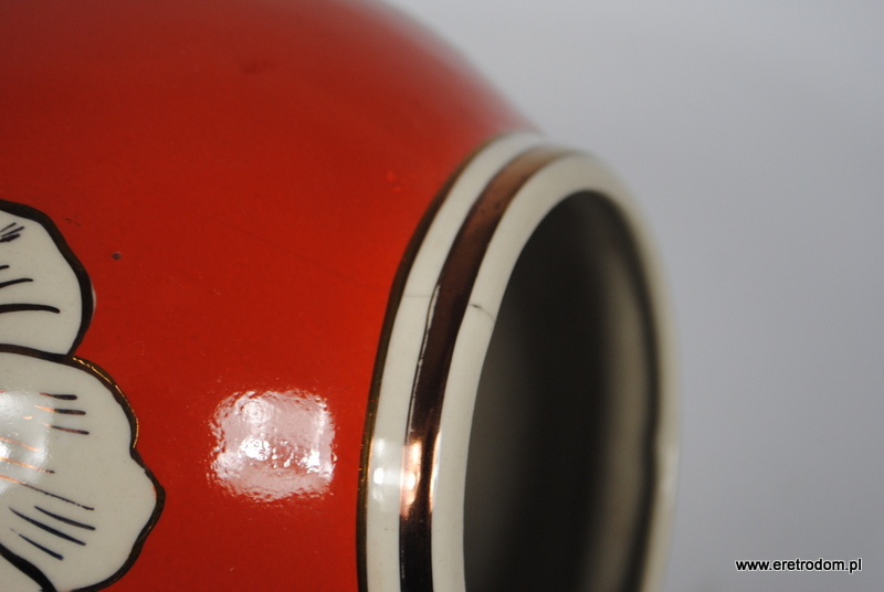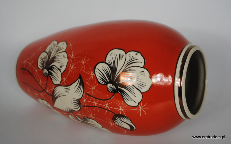 Duży wazon wyprodukowany w Zakładach Porcelitu w Chodzieży. Ozdobione kwiatową złoconą dekoracją, ręcznie malowany, sygnowany.
