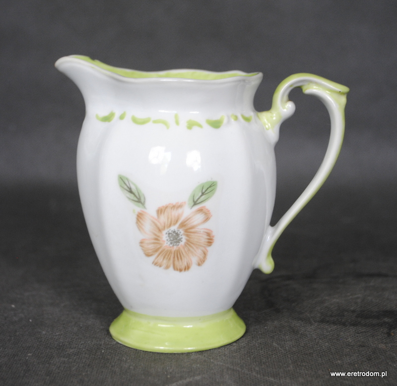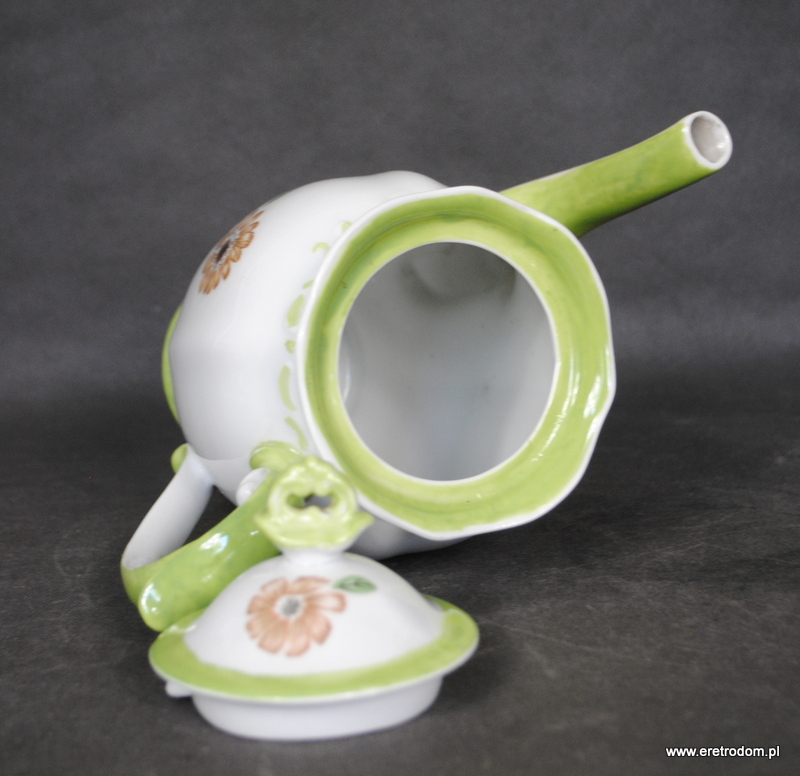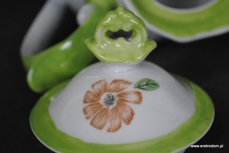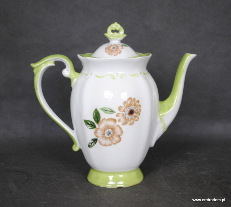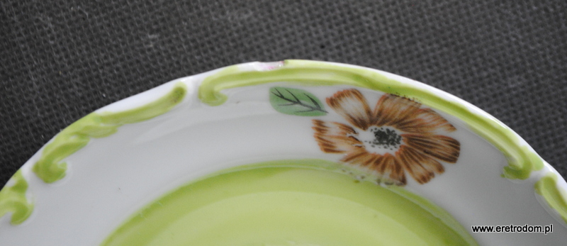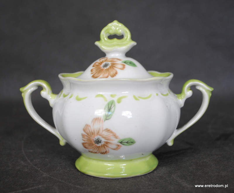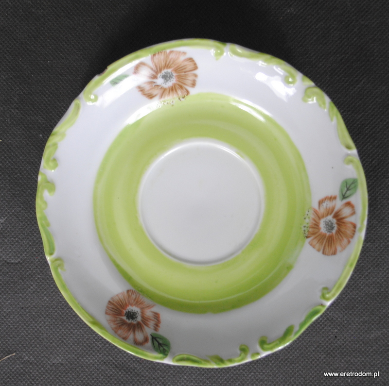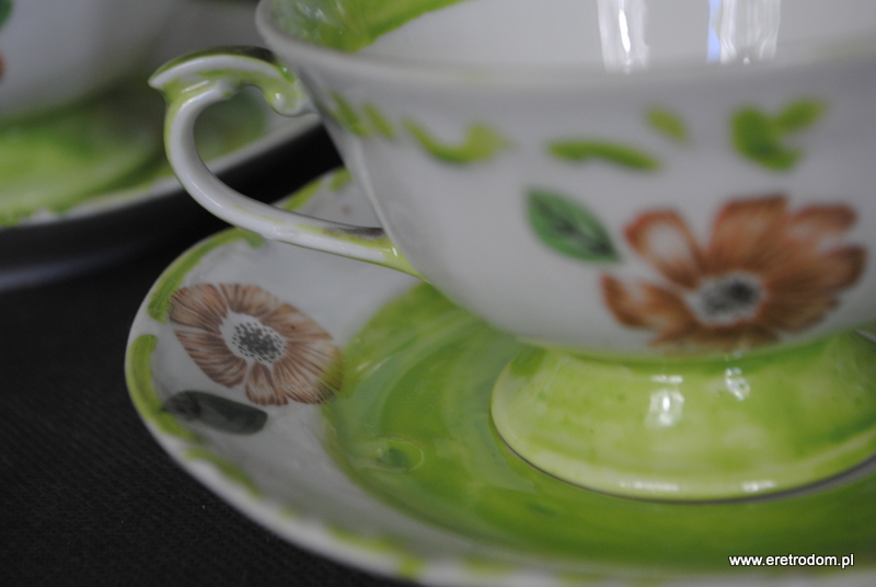 Zestaw porcelany wyprodukowany w Chodzieży. Malowany w prywatnej malarni. Biała porcelana ozdobiona kwiatową kalką, malowana na świeży zielony kolor. Zestaw dla 6 osób.