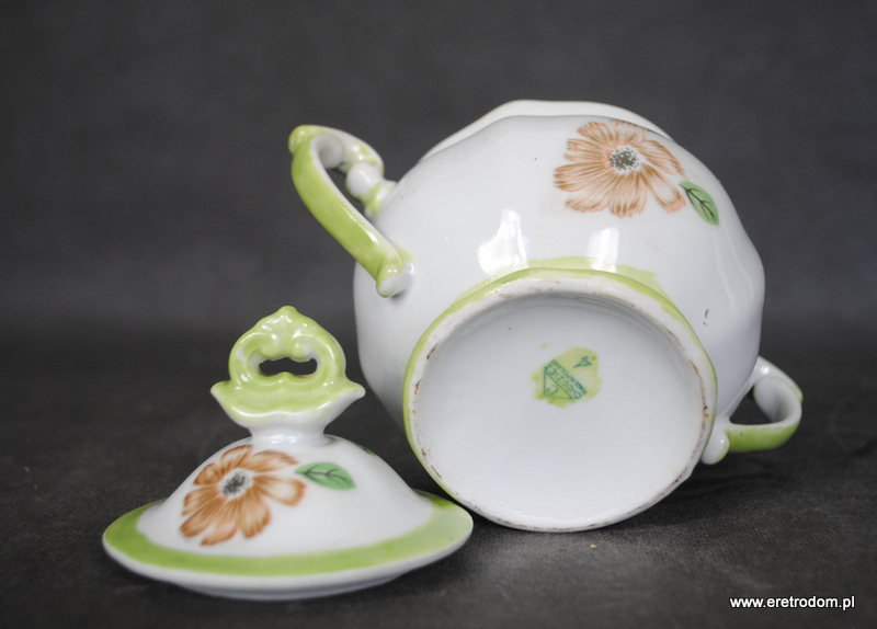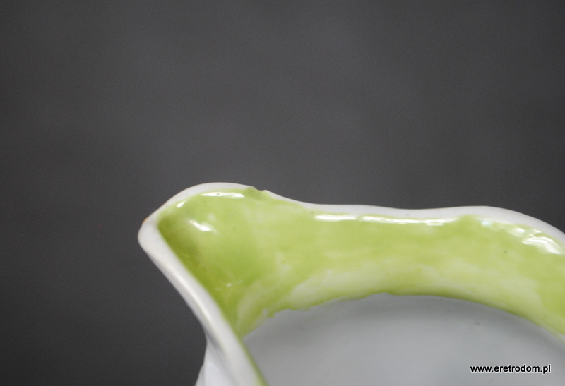 Stan: jeden spodek oraz jedna filiżanka posiada odprysk na rancie, mlecznik posiada zamalowaną wadę produkcyjną na rancie.