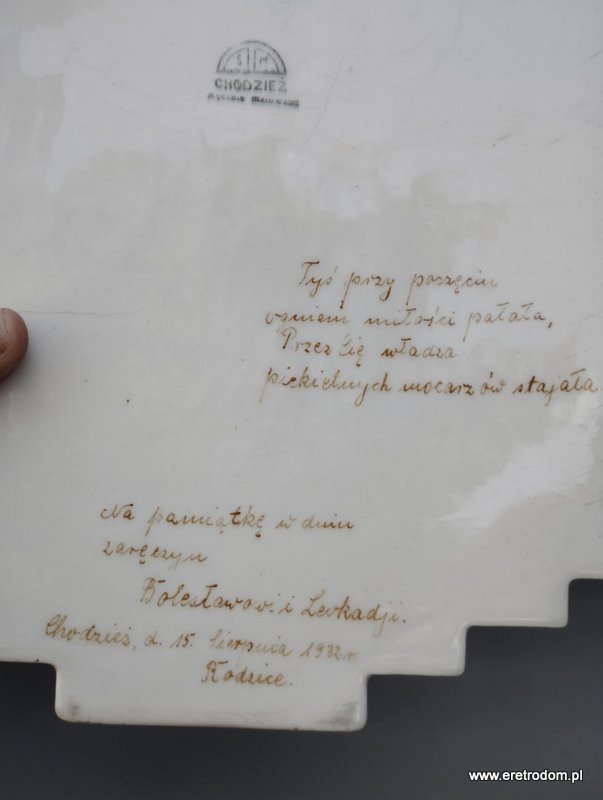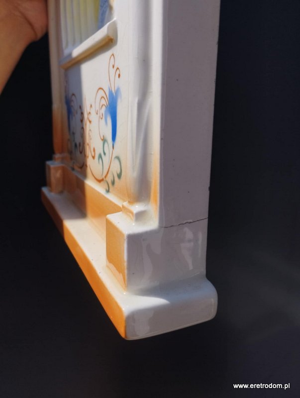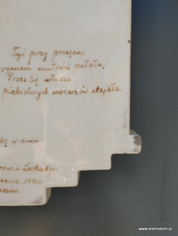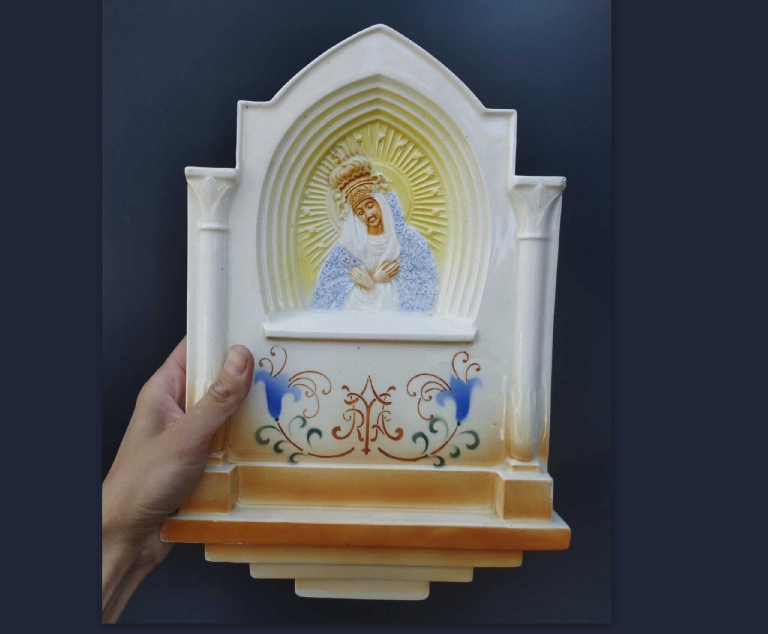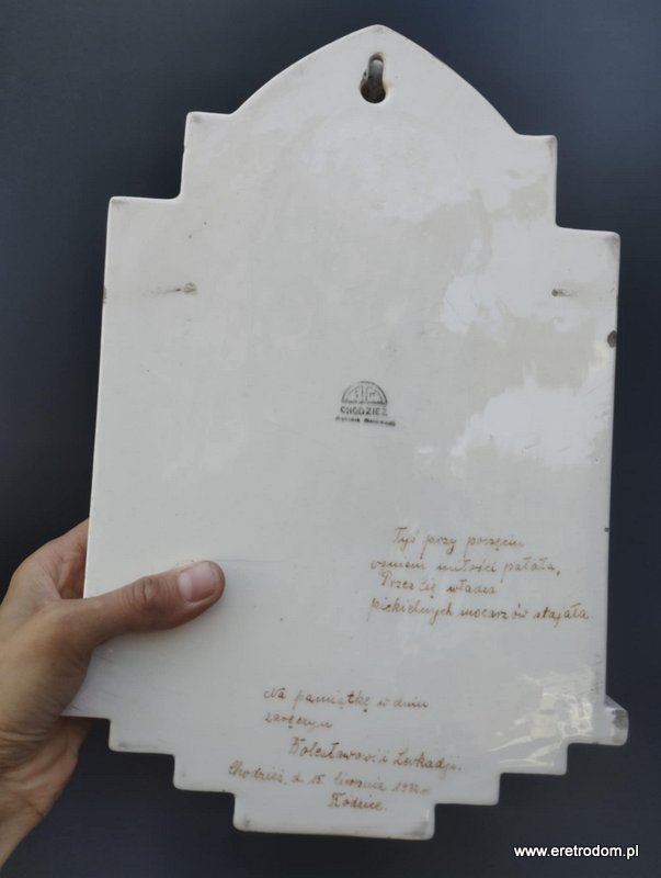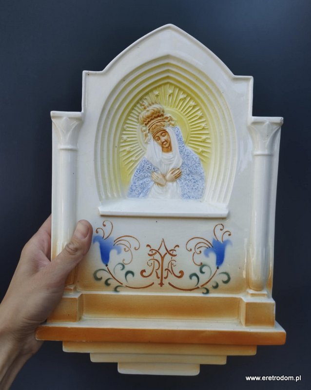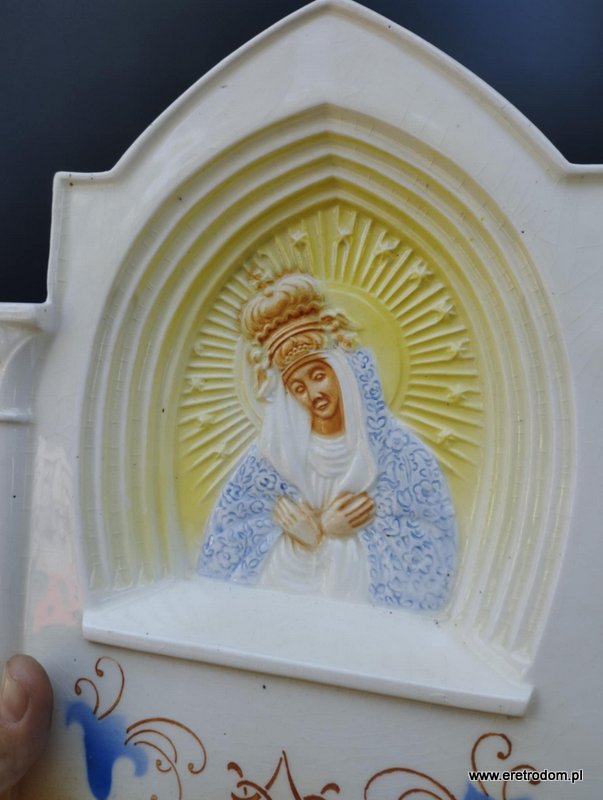 Kapliczka wykonana z fajansu w wytwórni Stanisława Mańczaka. Z dedykacji na odwrociu wykona, że pochodzi z początku lat 30 XXw. W tylnej części podszkliwnie pisana dedykacja z czego wynika, że kapliczka mogła powstać na specjalne zamówienie.Fajans malowany natryskowo (spritz dekor), piękne wykonanie. Rzadkość.