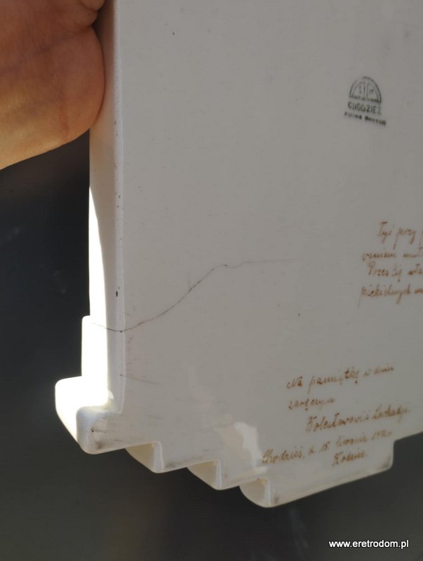 Stan dobry, kilka odprysków na rancie oraz stare spękanie w dolnej części.