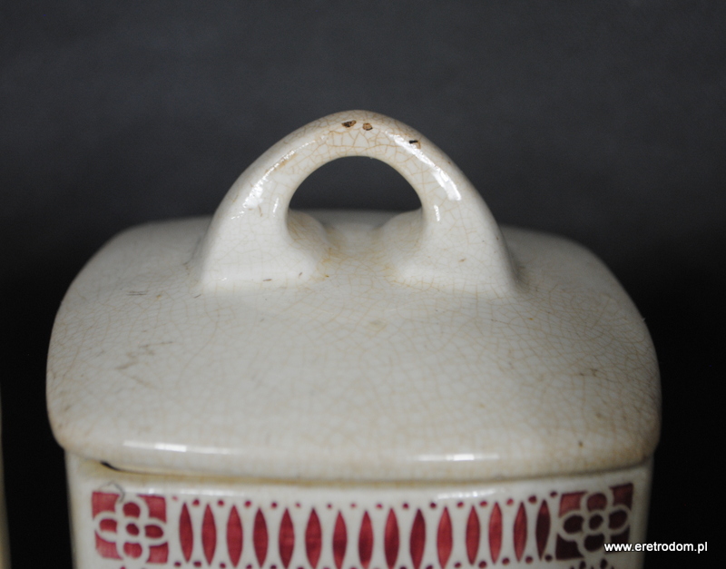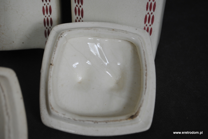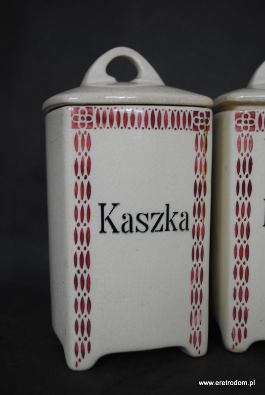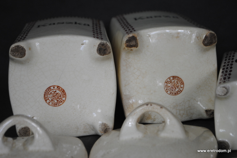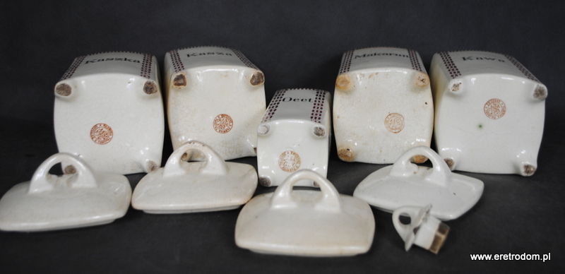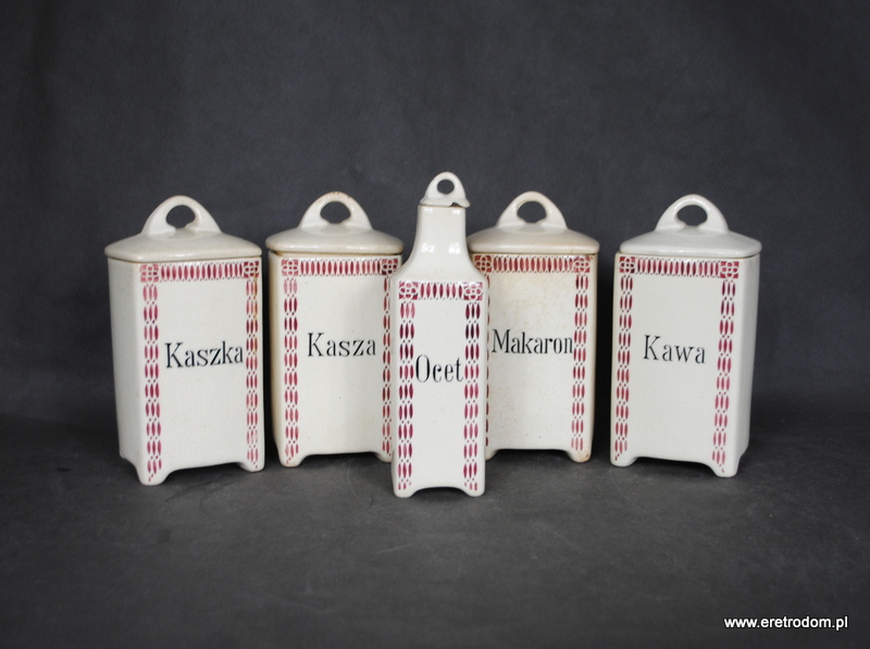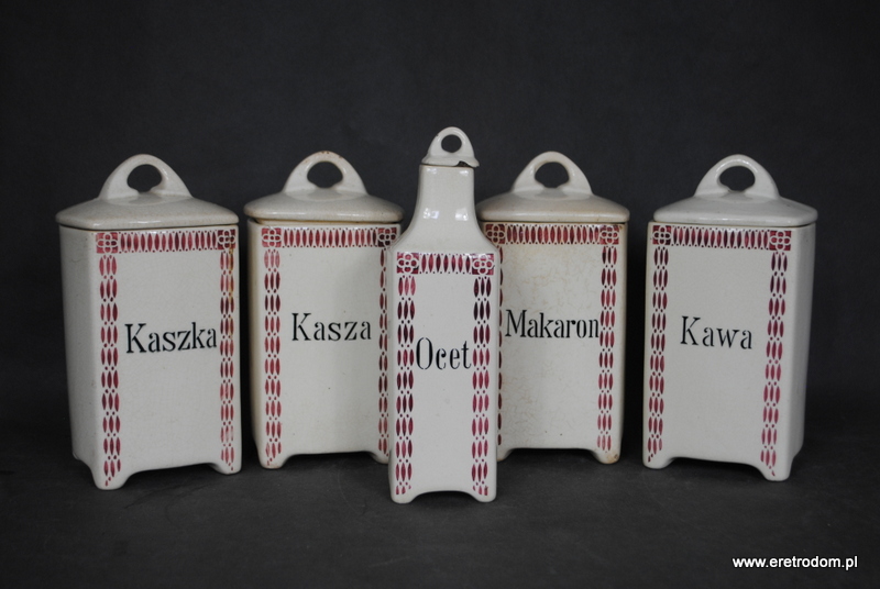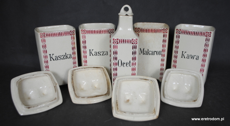 Zestaw 5 pojemników kuchennych. Sygnowane Chodzież, Stanisław Mańczak. Ceramika ręcznie malowana, szkliwiona. W skład wchodzi 5 dużych pojemników oraz jedna butla na ocet.