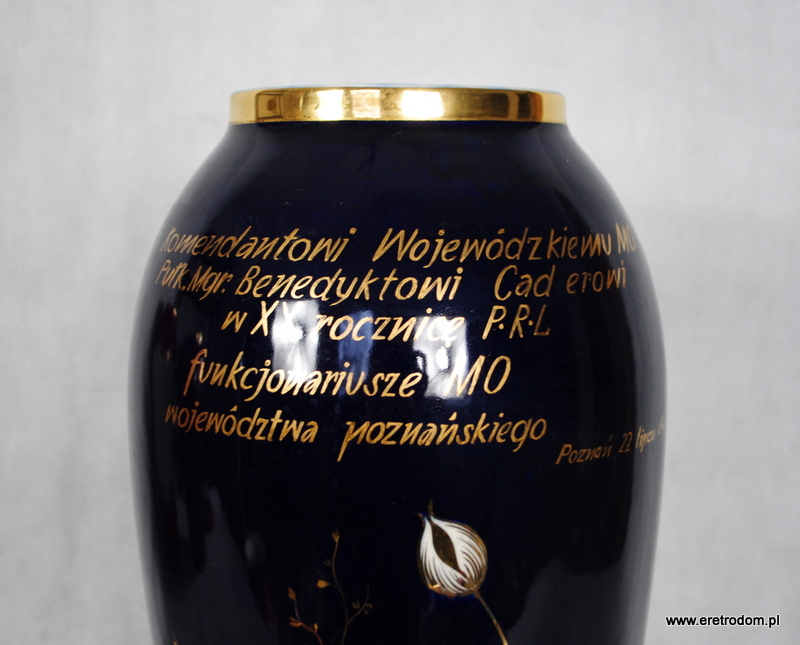 Wazon wyprodukowany w Chodzieży w roku 1964 z okazji XX rocznicy PRL. Porcelana malowana kobaltem i złotem. Z jednej strony widnieje napis z drugiej natomiast ręcznie malowane kwiaty.