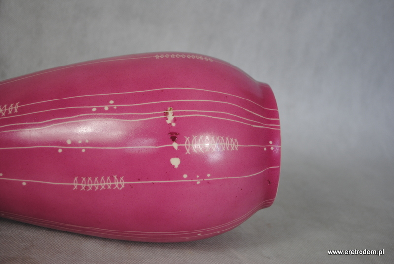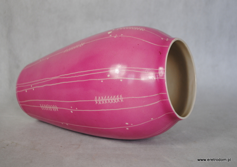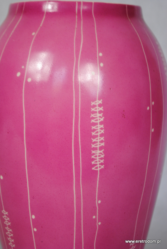Wazon sygnowany Chodzież. Porcelit malowany natryskowo na kolor różowy. Zdobiony metodą drapaną w stylu New Look.