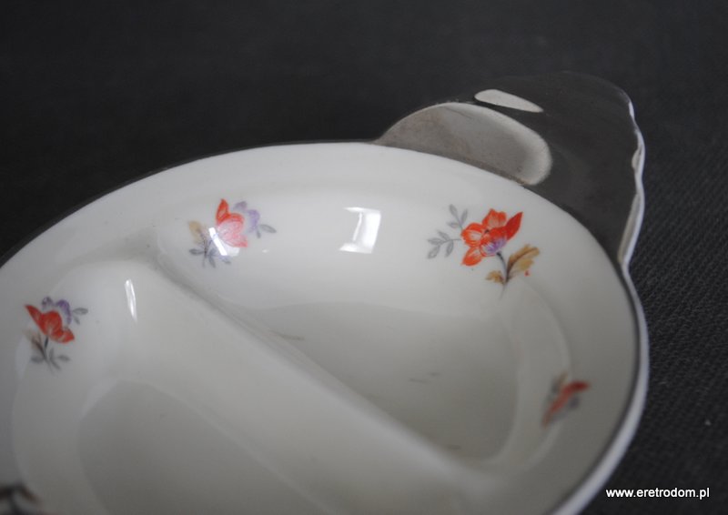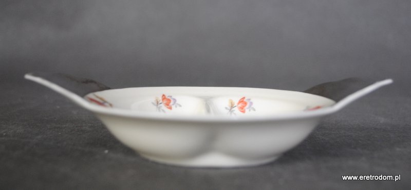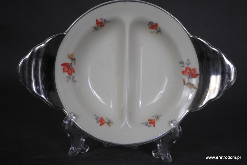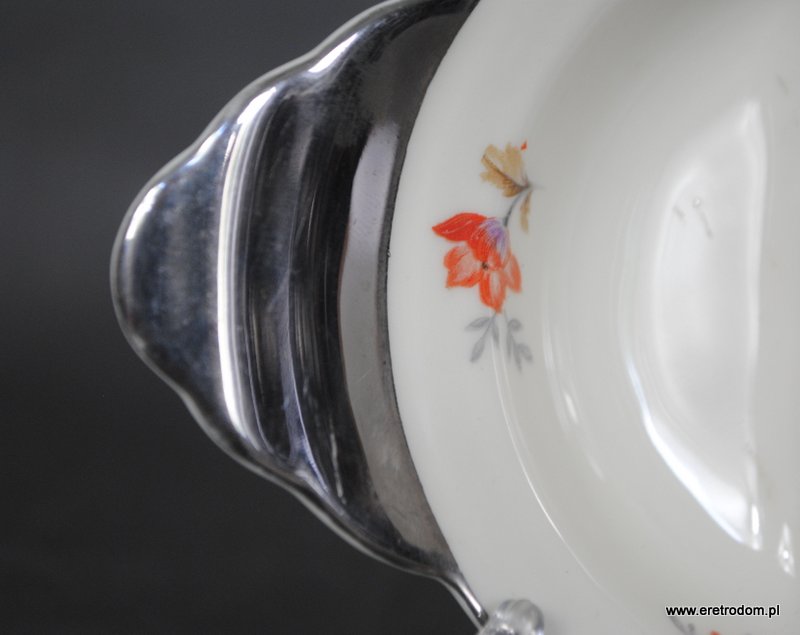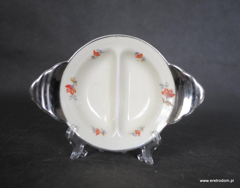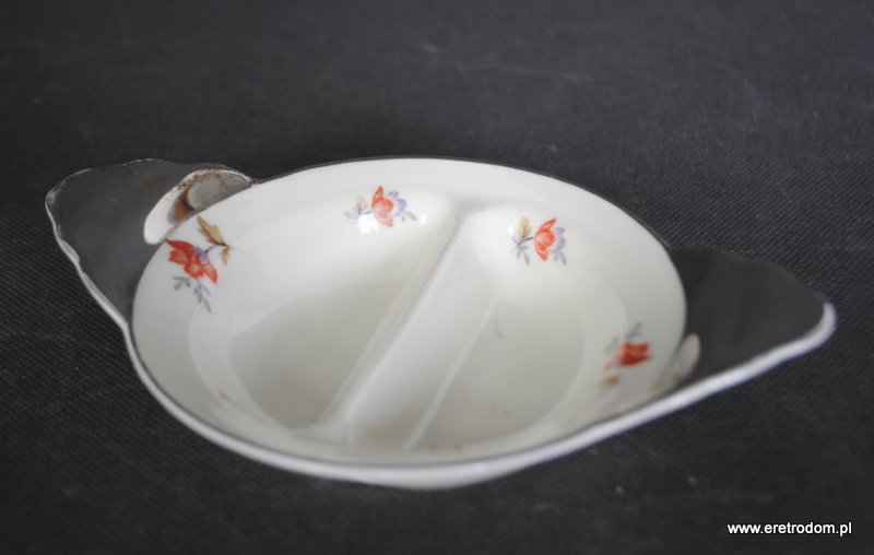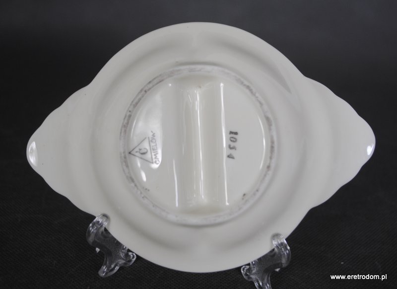 Dwojak sygnowany Ćmielów (I poł. XXw). . Porcelana w kolorze ecru ozdobiona platynowym wykończeniem oraz kalką kwiatową. Od spodu sygnatura producenta.
