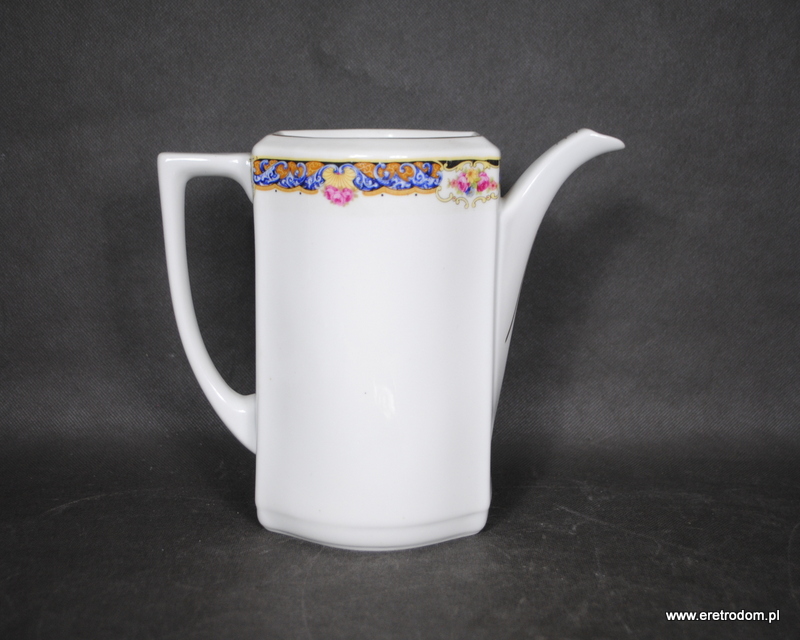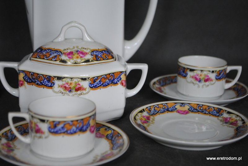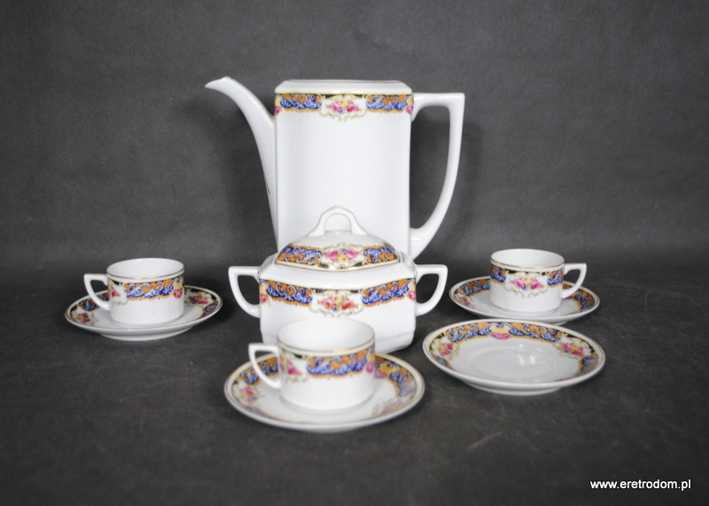 Elementy serwisu do kawy. Ćmielów, I poł. XXw. Biała, delikatna porcelana ozdobiona kalką. W skład zestawu wchodzi dzbanek przez przykrywki, cukiernica (pęknięcie na uchu), 3 filiżanki oraz 4 spodki.