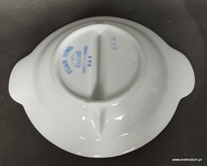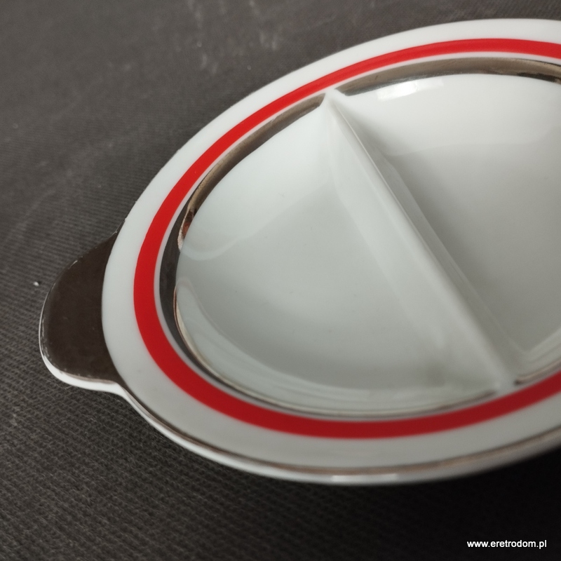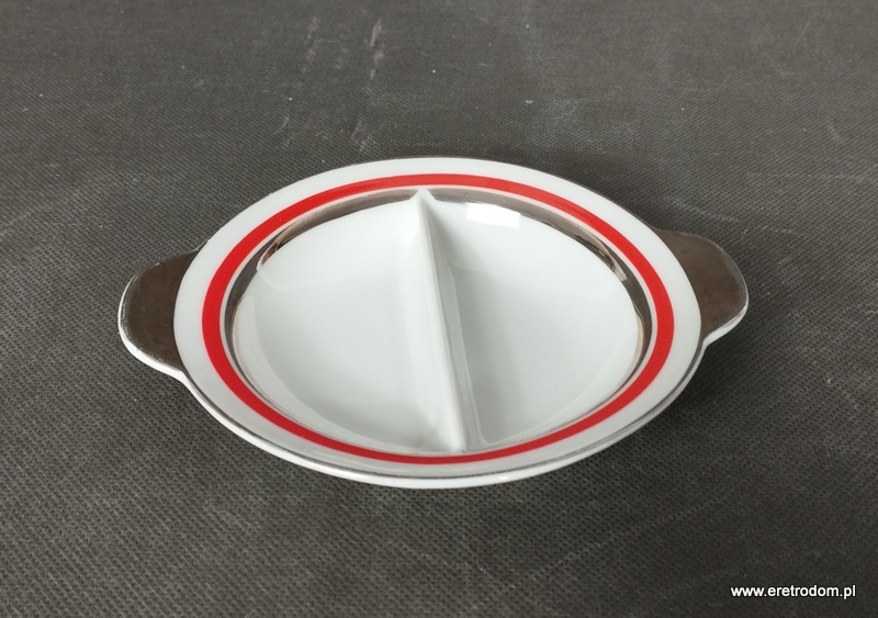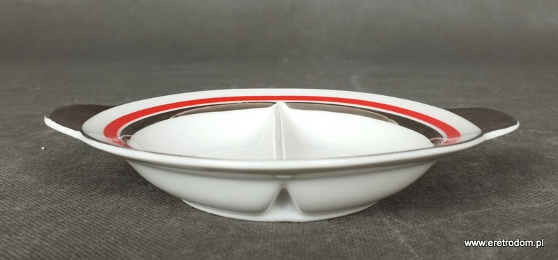 Dwojak sygnowany Ćmielów (I poł. XXw). Fason Ćmielów. Biała, delikatna porcelana ozdobiona platynowym oraz czerwonym paskiem. Od spodu sygnatura producenta oraz numer malatury 521.
