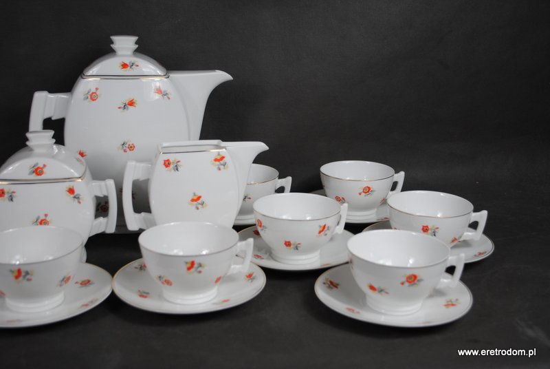 Ćmielów, zestaw dla 12 osób, fason Płaski. Projekt Bogdana Wendorfa z lat 30 XXw. Wersja z dużymi filiżankami. Delikatna biała porcelana zdobiona kwiatuszkami ( zdobienie 988).