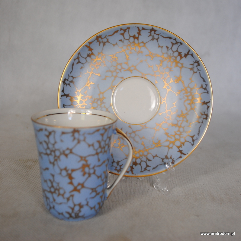 Filiżanka ze spodkiem, produkcja Ćmielów, lata 60 XXw. Fason Krokus, proj. Wincentego Potackiego. Biała, delikatna porcelana, złocona.