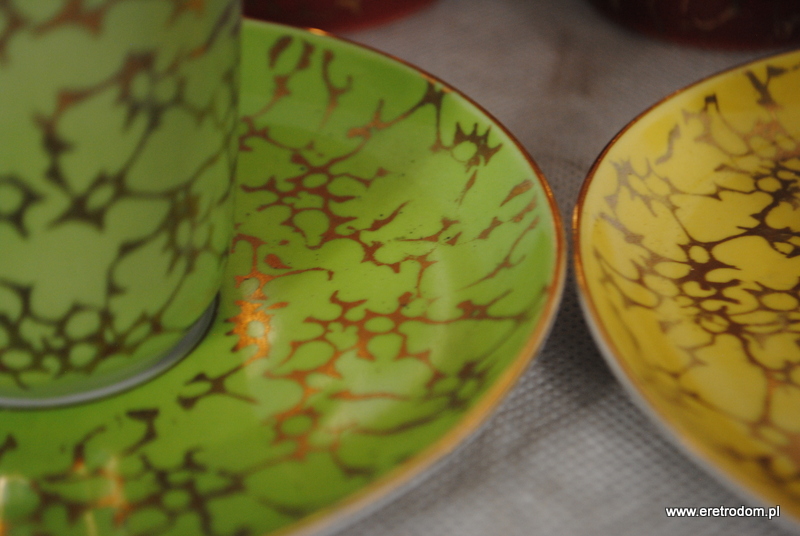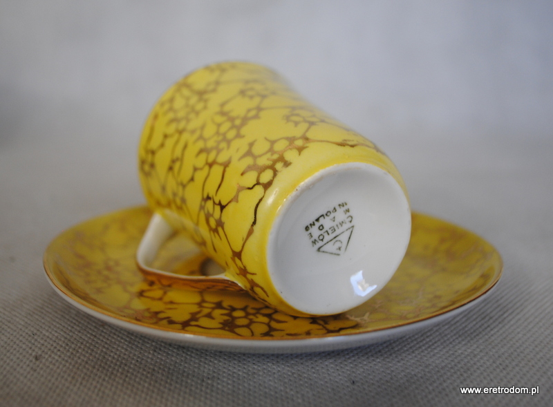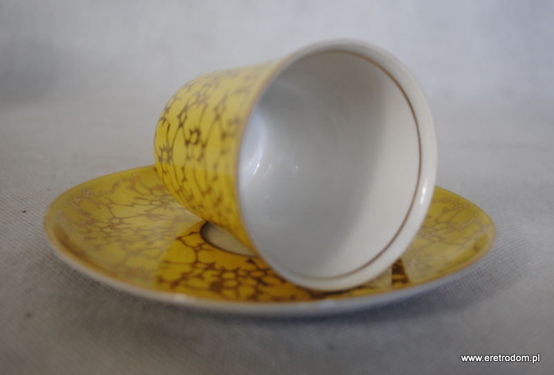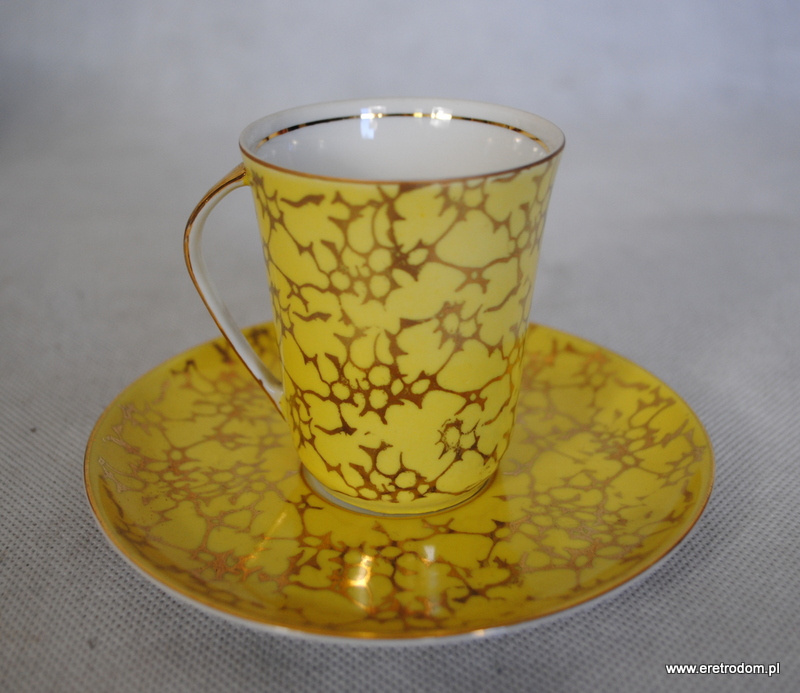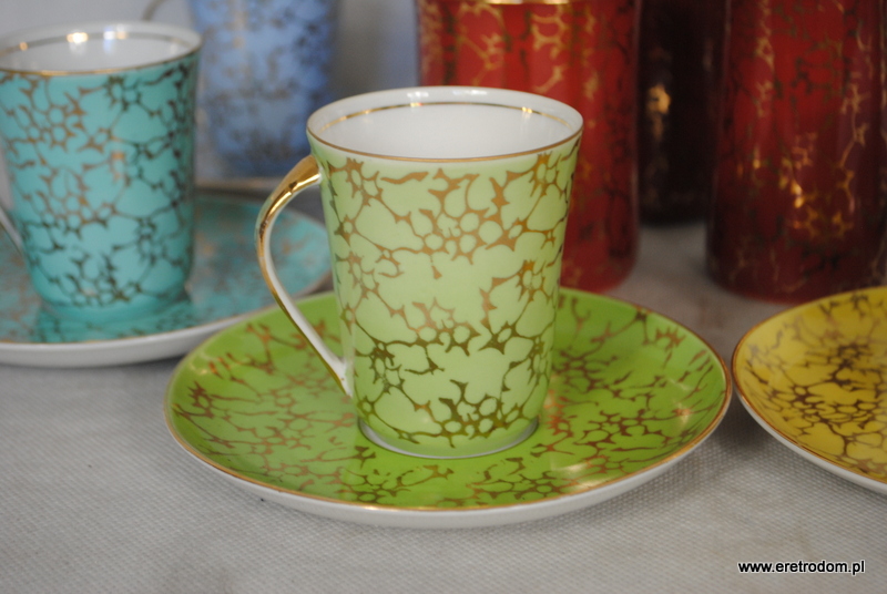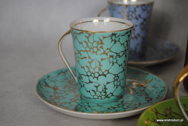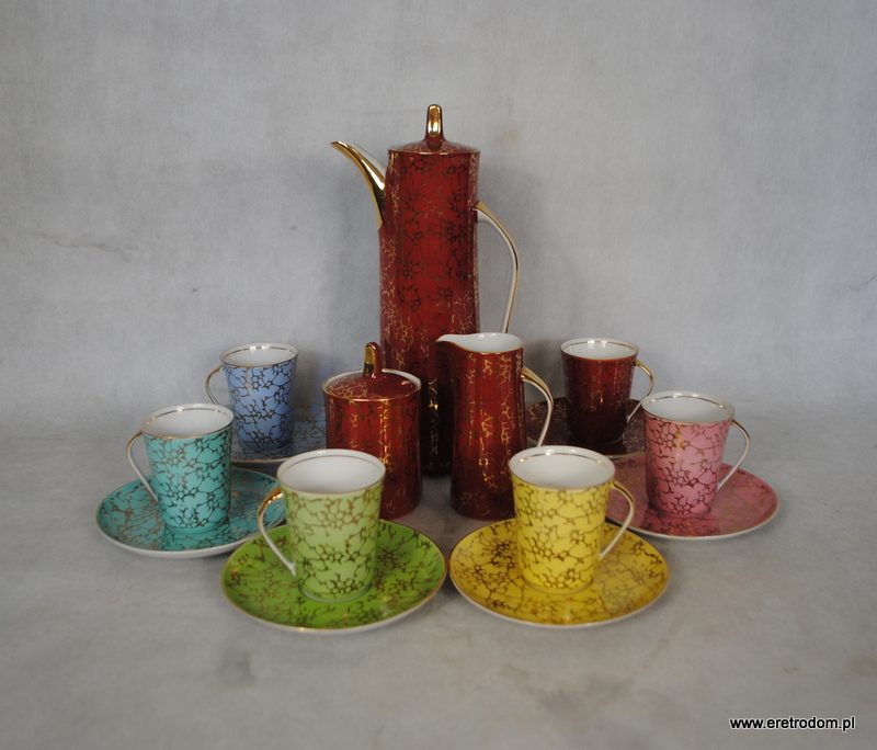 Zestaw do kawy, produkcja Ćmielów, lata 60 XXw. Fason Krokus, proj. Wincentego Potackiego. Biała, delikatna porcelana malowana na różne kolory, złocona. Komplet dla 6 osób.