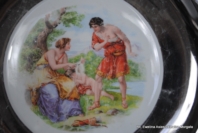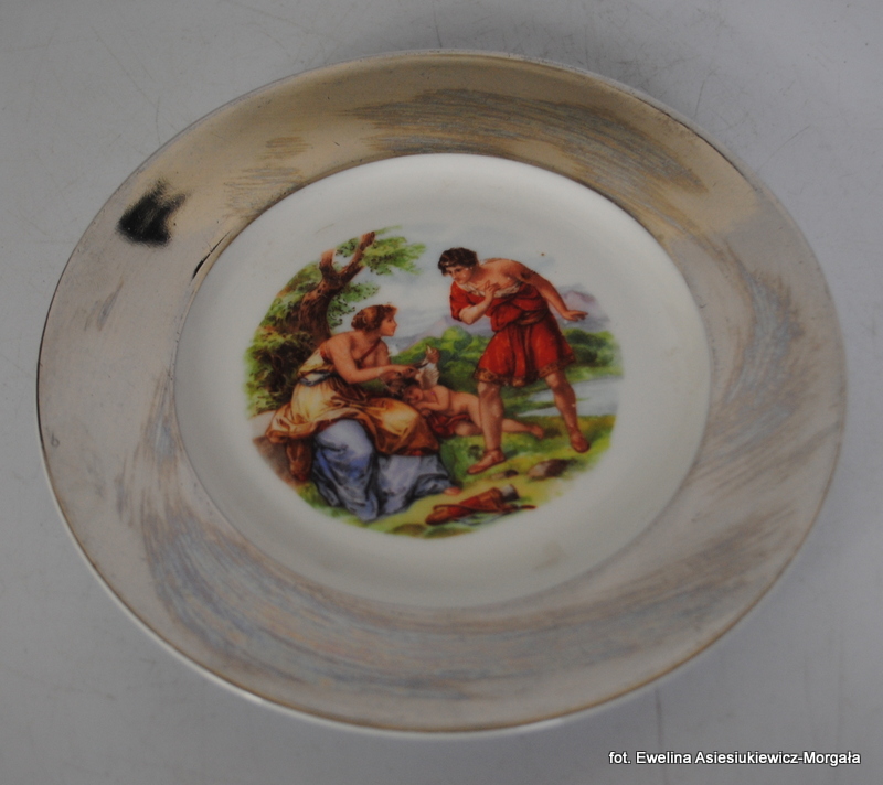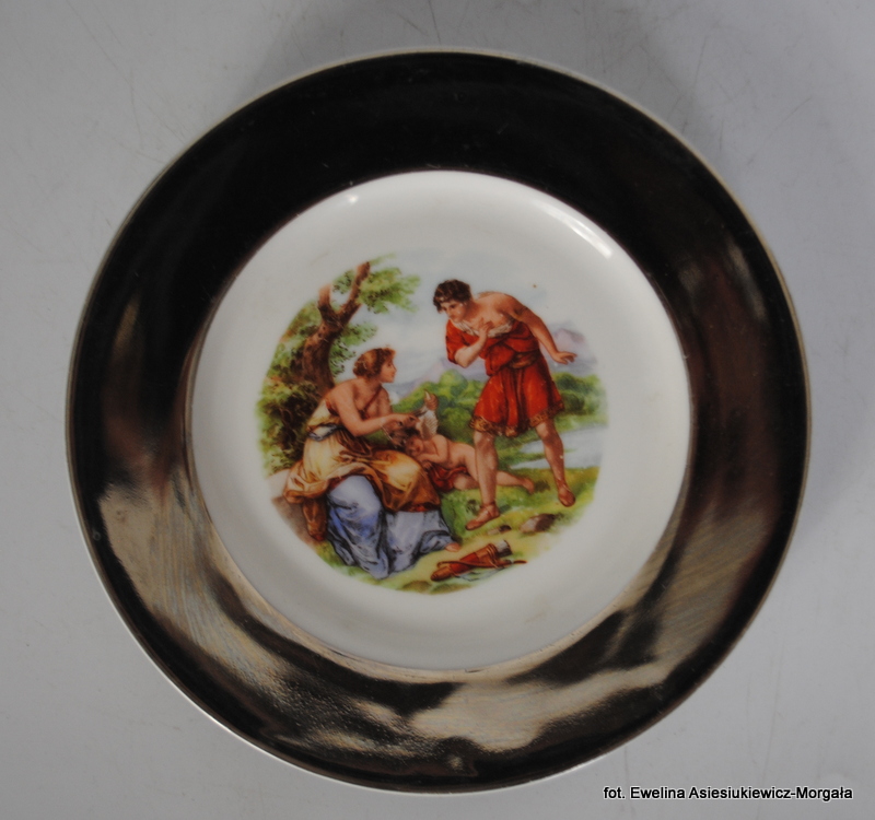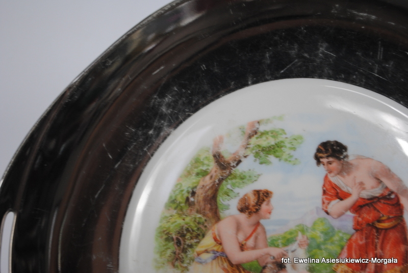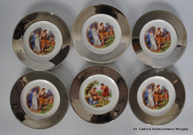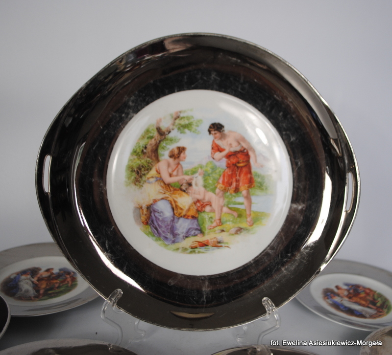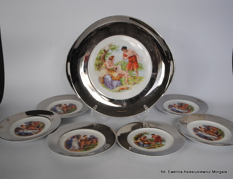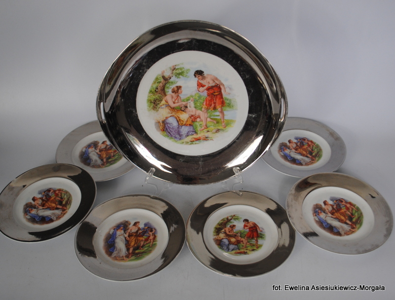 Zestaw do ciasta sygnowany Ćmielów ( I poł. XXw). W skład kompletu wchodzi patera na ciasto oraz 6 talerzyków deserowych. Biała porcelana, rant w kolorze platyny. W centralnej części scenka rodzajowa.