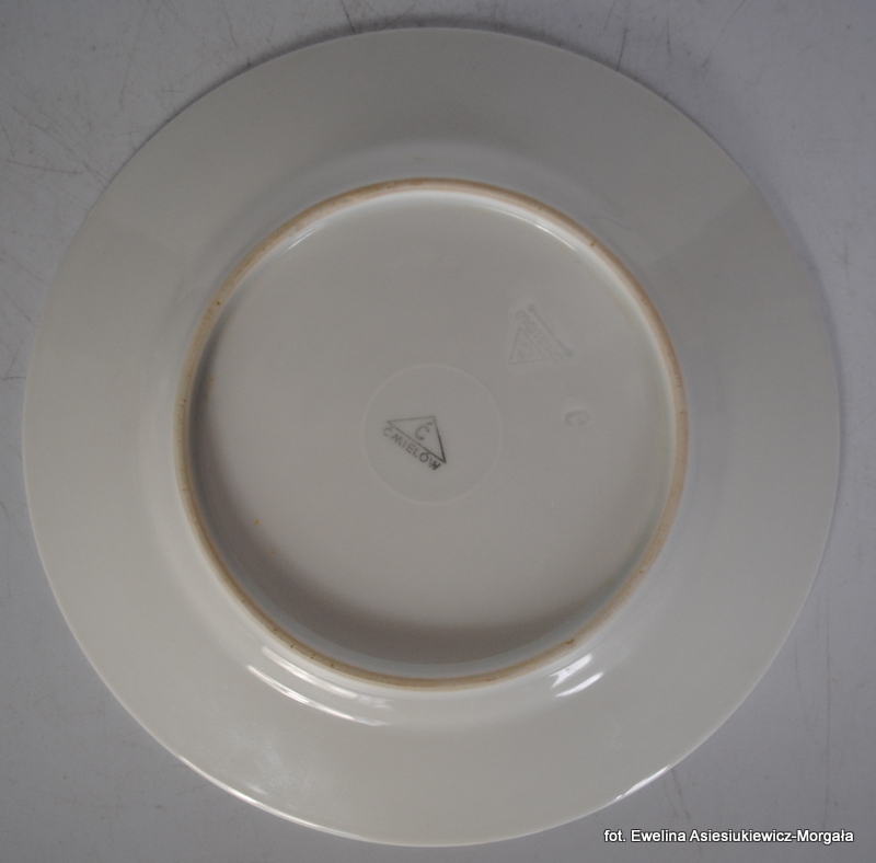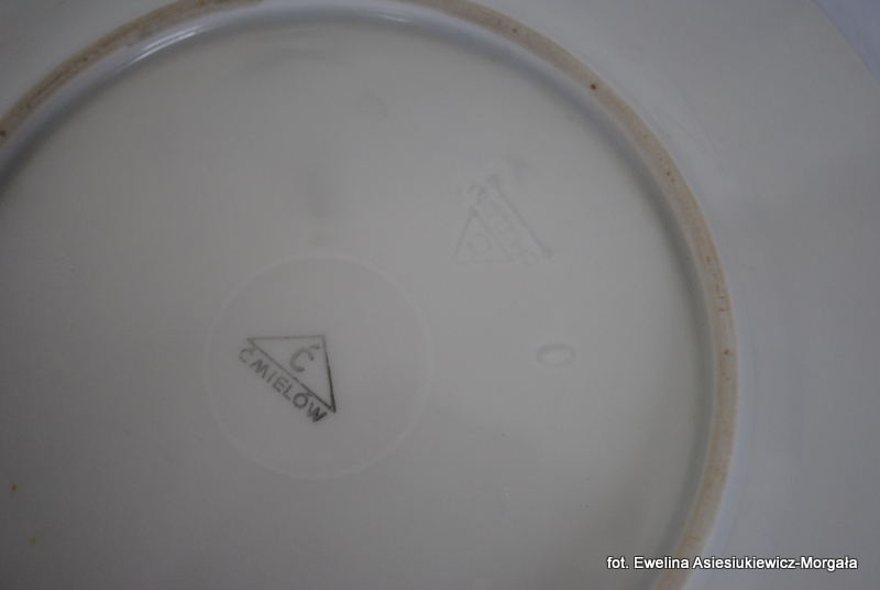 Stan dobry, jeden talerzyk deserowy posiada odprysk na rancie. Drobne ryski oraz przetarcia malatury powstałe z biegiem lat głównie na paterze do ciasta.