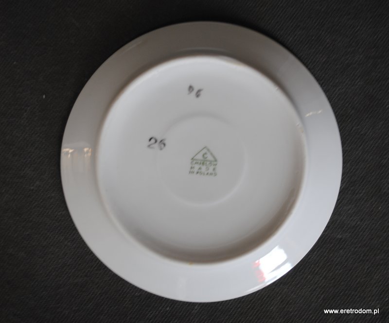 Spodek sygnowany Ćmielów. Lata 60 XXw. Biała porcelana malowana natryskowo, wydrapywana.