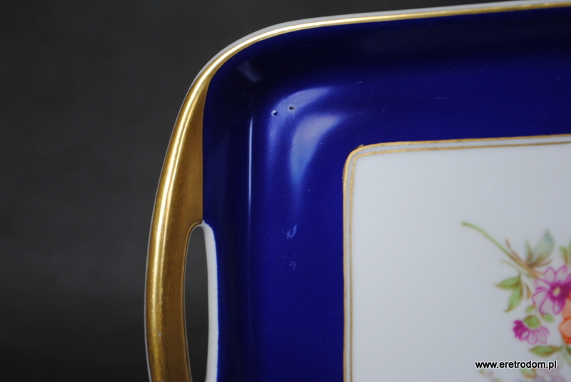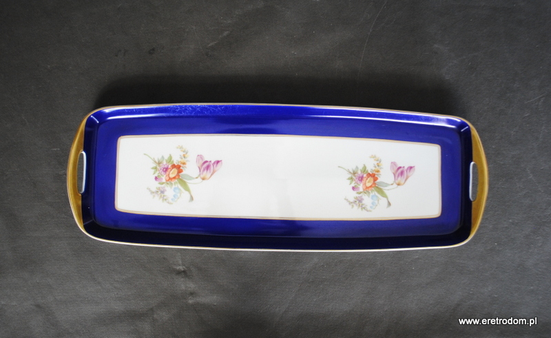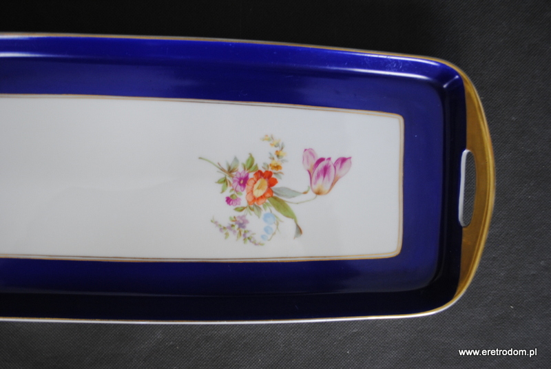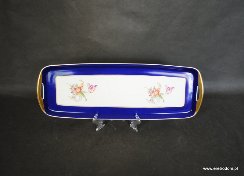 Patera długa czy też taca do omletu sygnowana Ćmielów (sygnatura z lat 1926-1939). Biała porcelana przy rancie malowana kobaltem oraz złocona. W centralnej częsci kwiaty.